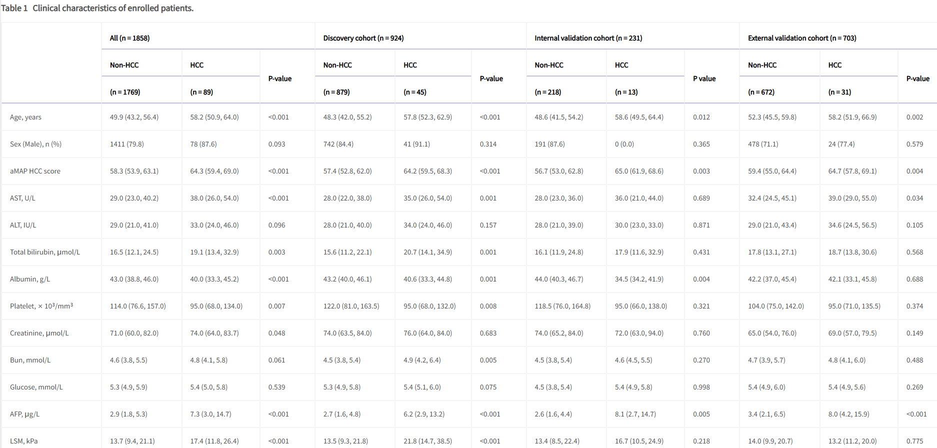 本研究共纳入来自11个中心的1858例符合条件的患者,其中1836例(98.82%)患者来自PreCar队列,这其中括67例HCC患者;另外22例患者(1.18%,均为HCC病例)来自南方医院的门诊患者和Search-B队列。在这些患者中,924名被分配到发现队列,231名被分配到内部验证队列,703名被分配到外部验证队列。发现队列中的45名参与者(4.9%)、内部验证队列中的13名参与者(5.6%)和外部验证队列中的31名参与者(4.4%)在3-12个月的随访CT扫描后被诊断出患HCC。从CT检查到诊断为0、A、B、C和D期HCC的平均时间间隔分别为6.0、6.8、7.2、11.0和9.7个月。患者特征如表1所示。