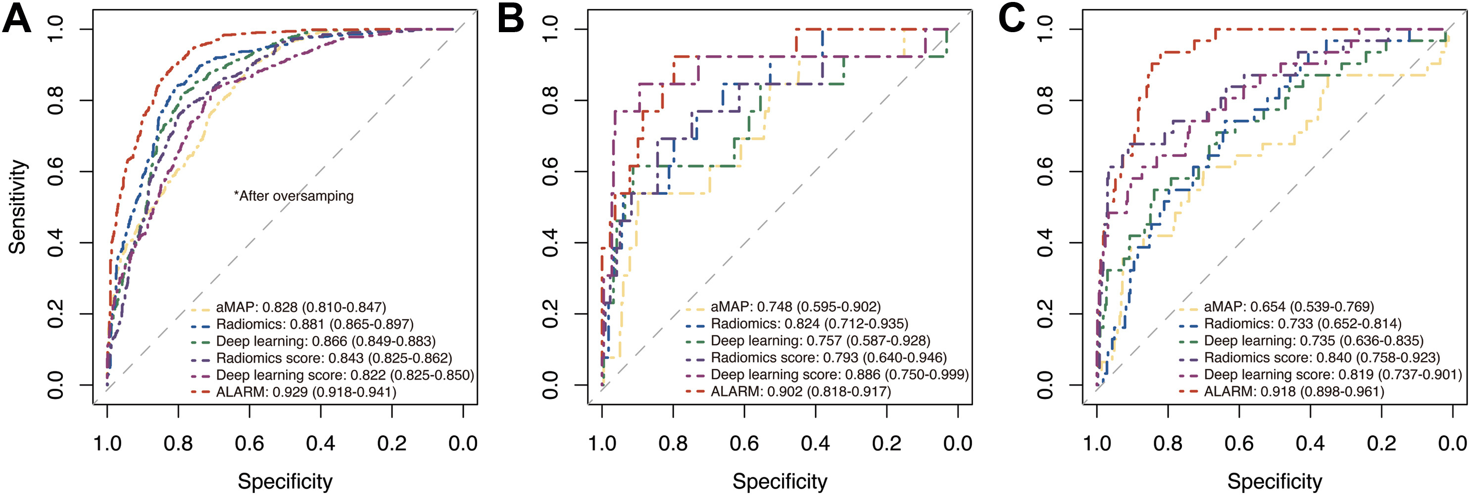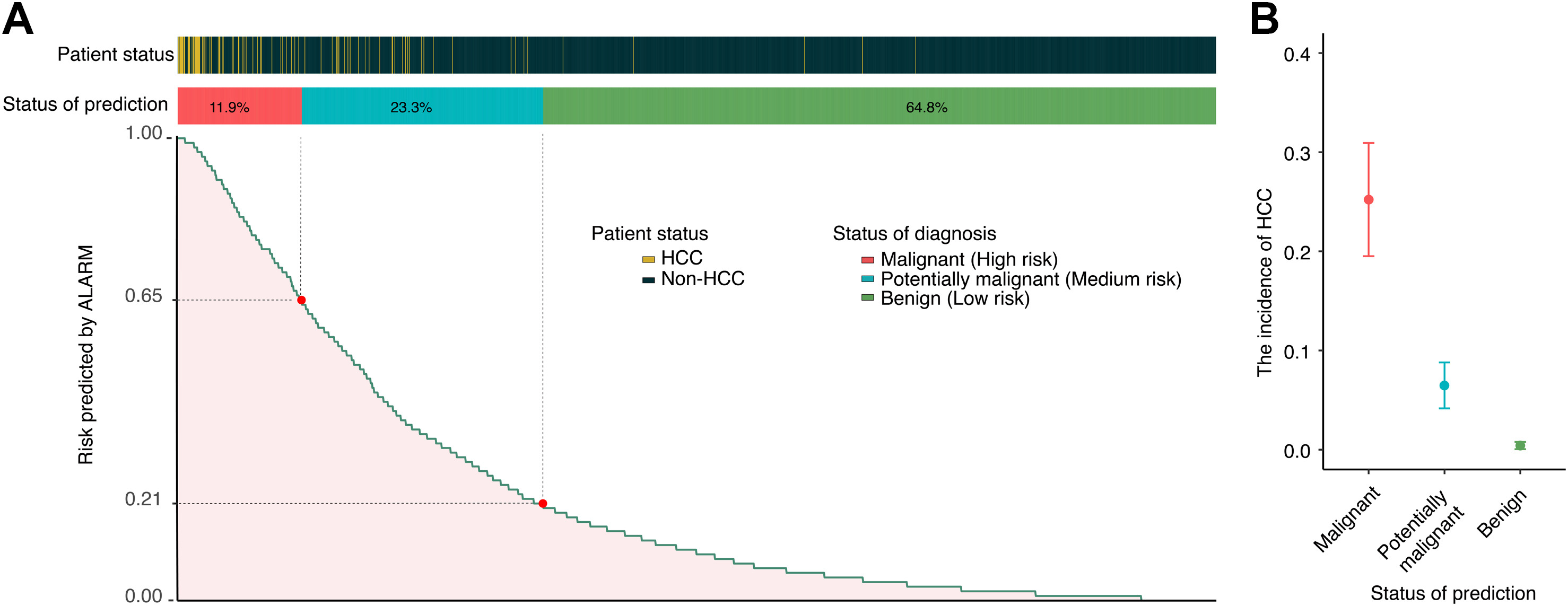 选取2018年6月至2020年1月期间在11个中心研究的1858名肝硬化患者,在最终诊断为HCC或非HCC的前3-12个月里,收集了三期CT图像和实验室结果。使用影像组学和深度学习技术,在发现队列(n=924)中开发了早期预警模型(ALARM),然后在内部验证队列(n=231)和来自10个外部中心的外部验证队列(n=703)中进行了验证。ALARM作为一个综合模型,将影像组学和深度学习评分与aMAP HCC风险评分相结合,可以提前识别大多数HCC发生个体。ALARM具有在临床环境中实际实施的潜力,可以对肝硬化患者的肿瘤发生进行早期预警。