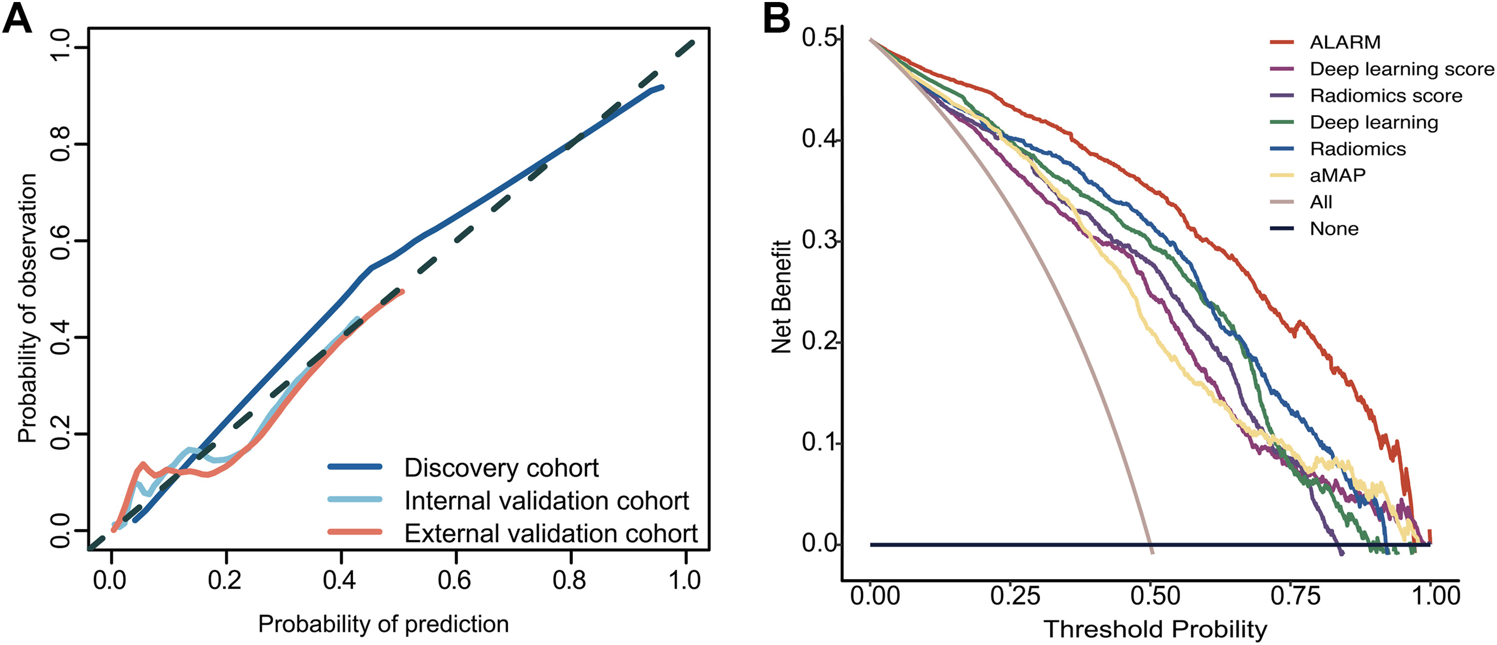 ALARM模型是通过使用临床评分、放射组学评分和深度学习评分作为三个单独的协变量来拟合逻辑回归模型开发的。对于临床评分,作者尝试了将临床变量与放射组学评分和深度学习评分进行各种组合,包括aMAP、年龄、性别、总胆红素、白蛋白、血小板计数和AFP。结果表明,放射学评分、深度学习评分和aMAP评分的组合明显优于其他组合。即使AFP包含在这些变量中,根据Delong检验,他们的表现也没有显著改善。因此,选择aMAP评分作为临床评分中的变量。此外,作者发现ALARM表现出了很好的区分性能,这在发现队列、内部验证队列、外部验证队列中通过自举验证得到了证实(图3)。作者还对每个队列进行了交叉验证,并证明了模型在不同折叠下的稳定性能,进一步证实了方法的可靠性。DeLong检验显示,ALARM和单特征模型之间存在统计学上的显著差异(P<0.05),表明ALARM在预测肝硬化患者短期HCC发展方面表现出色。还将ALARM的性能与使用NRI和IDI分析的单特征模型的性能进行了比较,结果表明,ALARM具有outstanding的性能。校准曲线显示,ALARM生成的预测概率与实际结果之间存在很强的一致性(图4A)。此外,决策曲线分析结果表明与单一特征模型相比,ALARM在临床决策中具有更优越的优势(图4B)。此外,亚组分析表明,无论年龄、性别和AFP水平如何,ALARM的性能都是一致的。