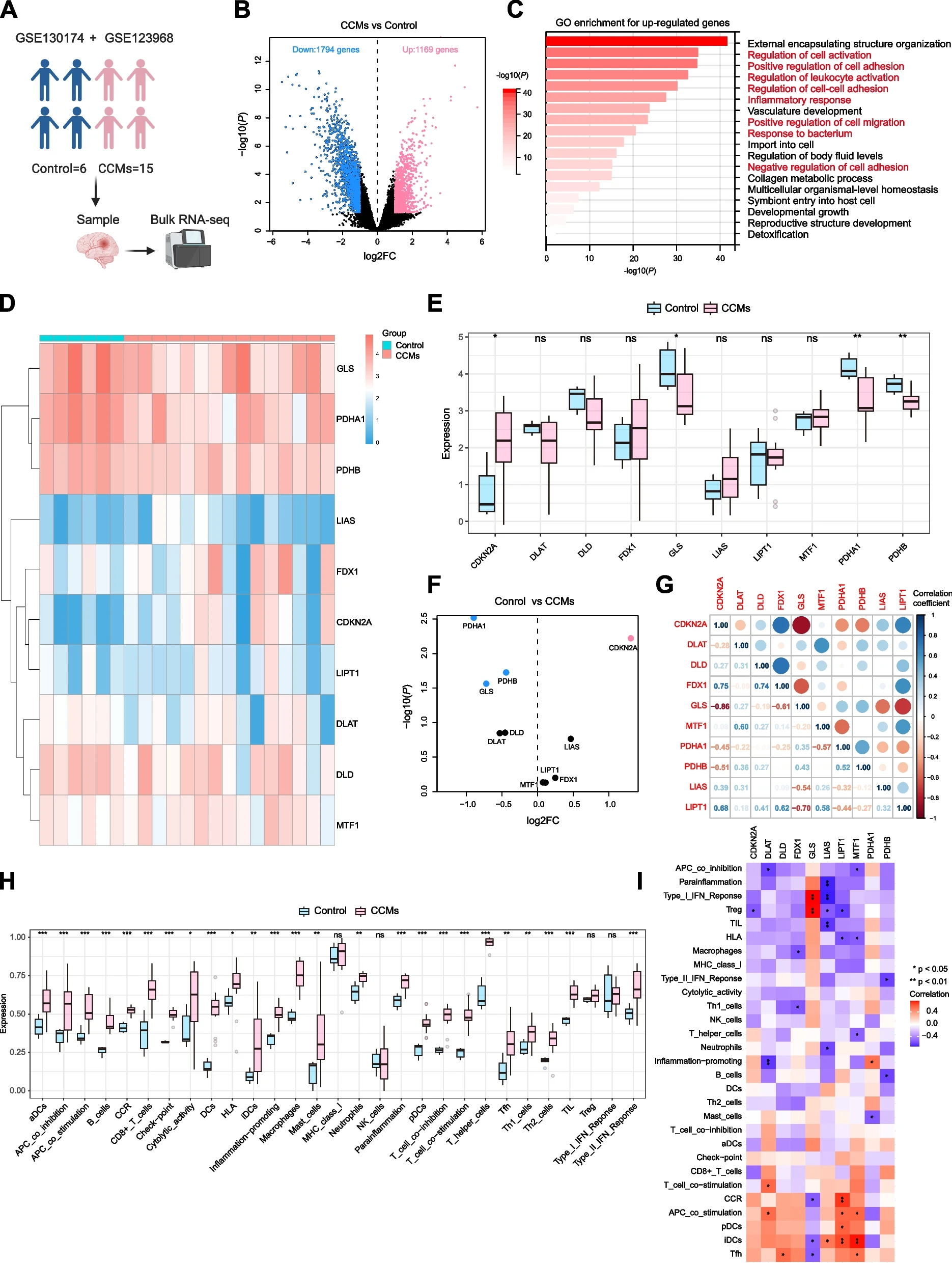 分析了21名患者的表达谱数据,其中包括6名对照组患者和15名CCMs组患者(图2A)共有2963个DEGs,1169个基因上调,1794个基因下调(图2B)。GO富集分析发现,上调基因主要富集在与免疫和血管生成相关的GO项中(图2C)。CRGs是来源以前发表的一篇文章,作者进一步研究CRGs在CCMs差异基因中的表达模式,结果表明,CDKN2A、GLS、PDHA1和PDHB这四个CRGs在对照组和CCMs组之间表现出明显的表达差异(图2D-F)。FDX1和LIAS在CCMs中的表达有所增加,但没有明显差异(图2E、F)。鉴于CCMs中上调的DEGs主要富集在CCMs的免疫调节中(图2G)。CIBERSORT免疫浸润表明CCMs中的免疫细胞明显增多,包括巨噬细胞、树突状细胞(DC)、B细胞和T细胞(图2H)。对CRGs与免疫细胞之间关系的分析表明,大多数CRGs与CCR(C-C趋化因子接收器)、T细胞协同刺激、APC(抗原呈递细胞)协同刺激、DCs和Tfh(T滤泡辅助细胞)呈正相关。在相反,它们与APC协同抑制、副炎、Treg(调节性T细胞)、IIFN型反应、TIL(肿瘤浸润淋巴细胞)、HLA(人类白细胞抗原)和大吞噬细胞(图 2I)。