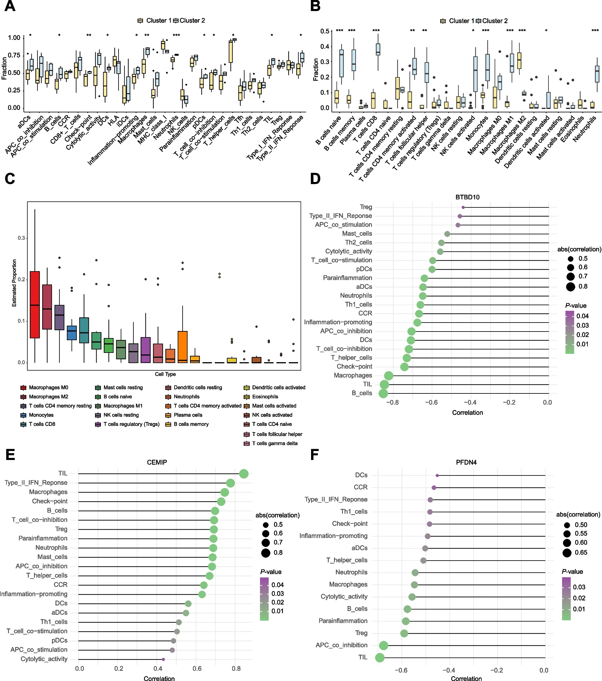 免疫微环境主要由免疫细胞、细胞外基质、各种生长和炎症因子以及独特的理化特征组成。这些因素对CMMs的发育或出血有重要影响。利用ssGSEA进行了初步分析,通过研究两个集群与免疫炎症侵润之间的相关性,探讨了导致CCMs进展的潜在分子机制。在多种免疫细胞中观察到了统计差异,包括活化的树突状细胞(aDCs)、B细胞、检查点、DCs、促炎细胞、巨噬细胞、神经滋养细胞、浆细胞状树突状细胞(pDCs)、T细胞共同抑制、T辅助细胞、TIL和IIIFN型应答组群1和组群2之间,组群2的免疫炎症水平明显高于组群1(图5a)。然后用CIBERSORT算法验证了ssGSEA的结果,得出了一致的结果(图5a)。值得注意的是,巨噬细胞,尤其是M0和M2型巨噬细胞,在CIBERSORT评估的所有免疫细胞中占很大比例(图5B-C)。第1组的中枢基因BTBD10和PFDN4与大多数免疫细胞(包括巨噬细胞和B细胞)呈显著负相关(图5D-F)。相反,第2组的中心基因CEMIP与大多数免疫细胞呈显著正相关(图5D-E)。