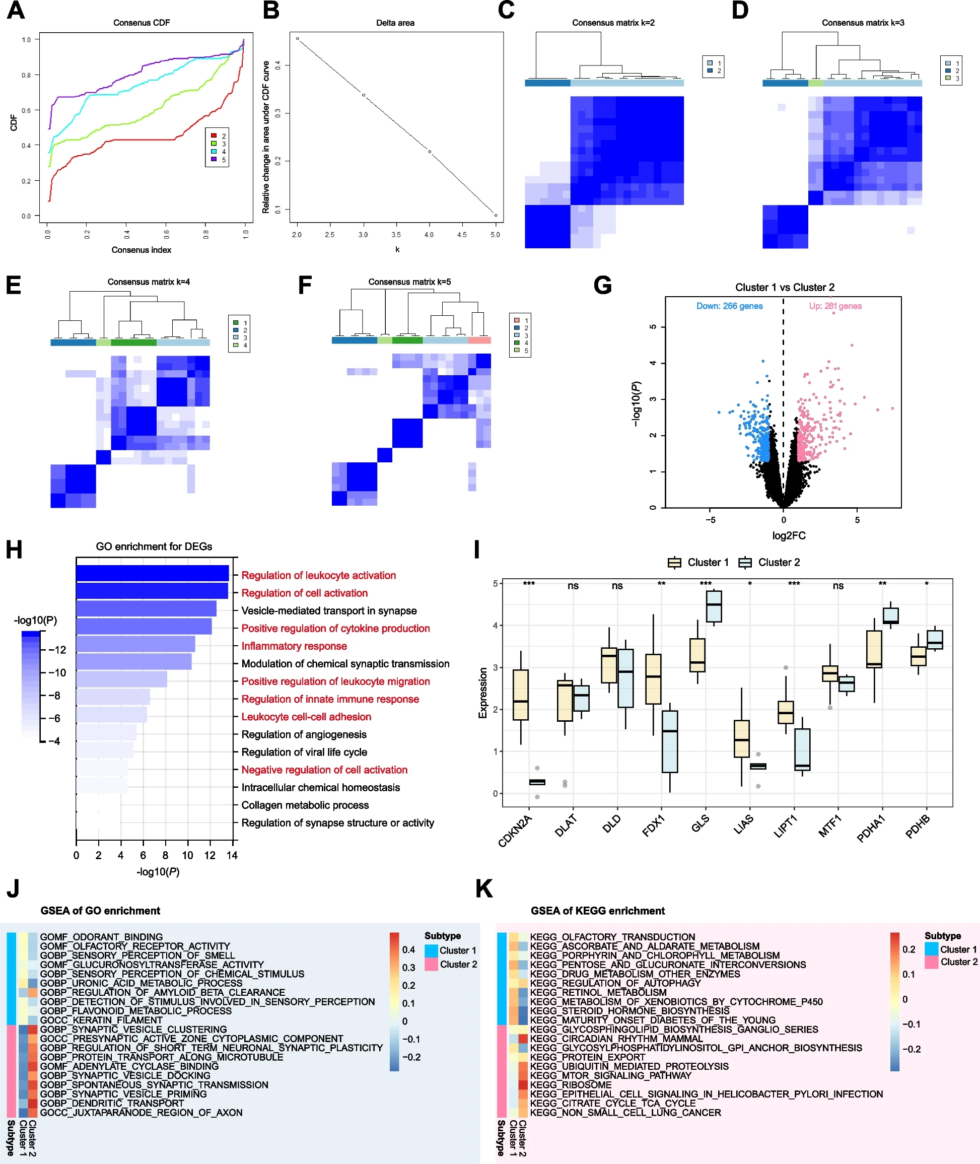 基于共识聚类方法以及筛选的差异CRGs来研究CCMs的铜死亡模式。分析结果显示,在k=2时,两个样本群集之间的区别更加明显,从而建立了两个不同的群集(图3A-F)。火山图被绘制出来以展示两个群集之间的差异表达基因(DEGs)分布,当群集1与群集2比较时,包括281个上调基因和266个下调基因(图3G)。GO富集分析显示,DEGs主要富集在免疫调节、血管发育和突触(图3H)。群集内CRGs的表达,并确定了七个表现出差异表达的基因(图3I)。