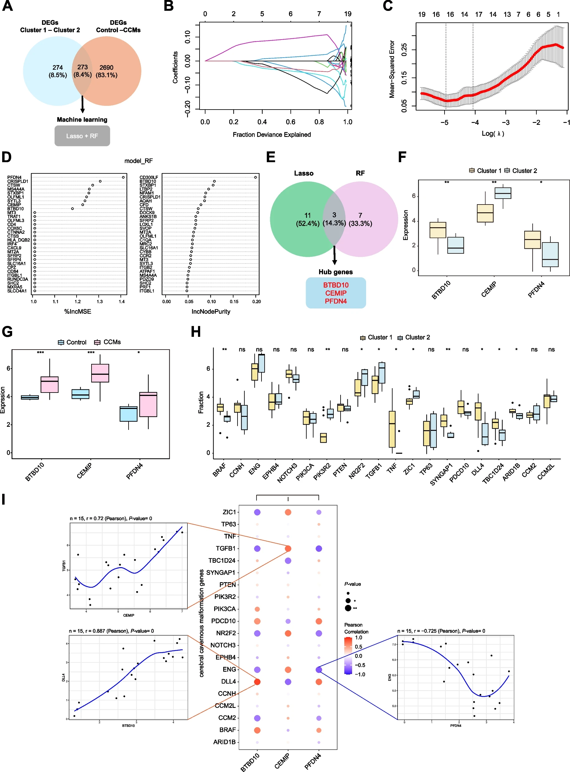 作者进一步从簇1与簇2、对照组与CCMs中精心挑选了273个交叉DEGs,用于筛选与CRGs聚类的不同亚型CCMs相关的特征中枢基因(图4A)。在筛选过程中采用了LASSO回归和随机森林算法。如图4所示,通过LASSO回归分析确定了14个与CCMs相关的特征基因。随机森林算法选择了一组10个特征基因(图4D)。然后将这些基因与LASSO回归算法得到的特征基因相交,最终得到三个重叠基因,即PFDN4、CEMIP和BTBD10(图4E)。这些基因在接下来的研究中将作为中心基因进行研究。BTBD10和PFDN4在聚类1中表达量很高、而CEMIP在第2组中高表达。此外,这三个基因在CCMs中都显著过表达(图4F-G)。此外,利用GeneCards数据库确定了与CCM相关的致病基因(图4H-I)。