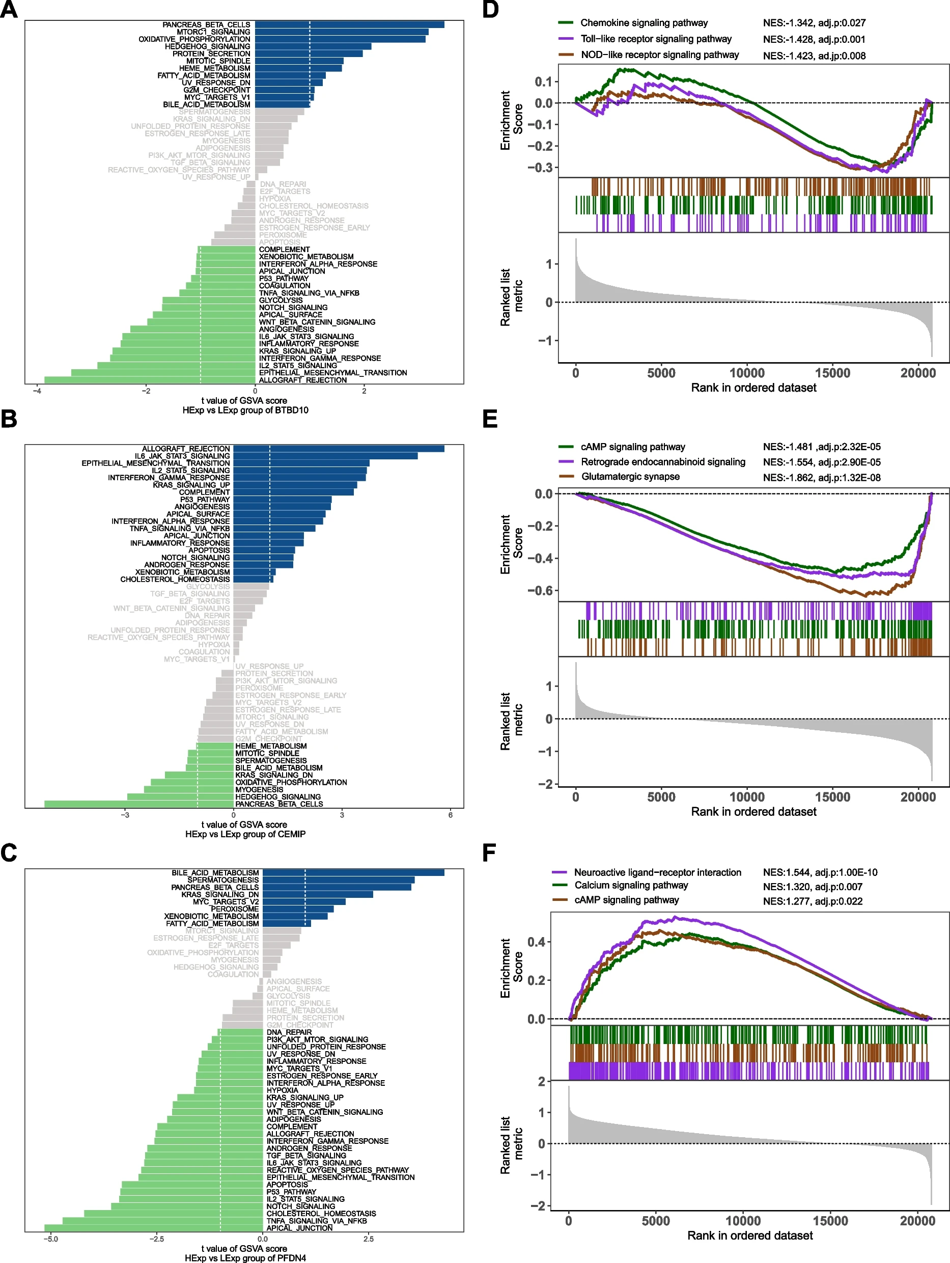 分析了三个枢纽基因所富集的信号通路,以研究它们影响CCMs进展的潜在分子机制。如图6所示,TeGSVA结果表明,BTBD10在高表达时主要激活mTORC1、脂肪酸代谢、刺猬和PI3K-ATK-MTOR信号转导等信号通路。6A、B表明,CEMIP的高表达主要富集于IL6/JAK/STAT3、血管生成、通过 NFκB的TNFA信号和炎症反应信号通路。同时,PFDN4的表达在胆汁酸代谢、KRAS信号转导和脂肪酸代谢中显著富集。GSEA分析结果表明,BTBD10在趋化因子、NOD样受体和Toll样受体信号通路中富集(图6D)。CEMIP在cAMP信号通路、谷氨酸能突触和逆行内大麻素信号通路中富集(图6E)。PFDN4富集于钙信号通路、cAMP信号通路和神经活性配体-受体相互作用(图6F)。这些发现表明,枢纽基因可通过调节血管内皮生长、炎症反应、线粒体能量代谢和细胞周期,对CCMs的进展产生重要影响。
