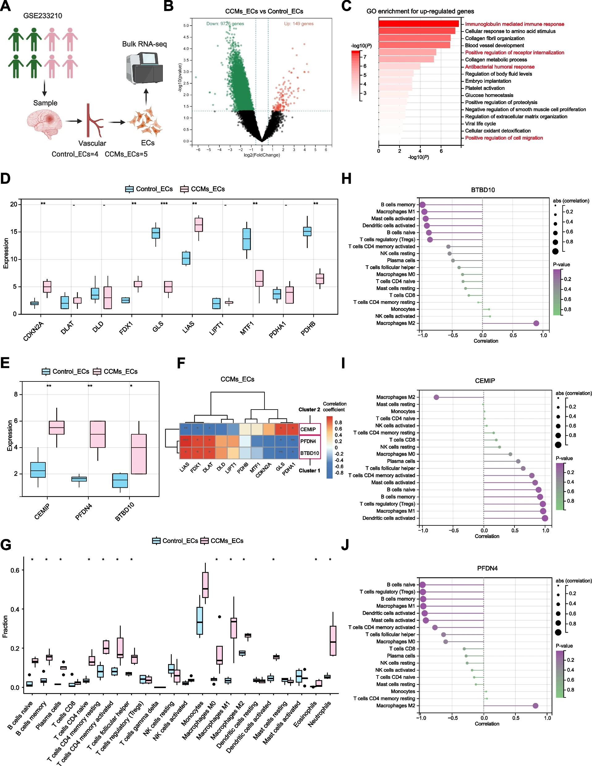 考虑到CCMs与血管生成的相关性,我们选择了包含ccm内皮细胞的RNA-seq数据集。以验证枢纽基因在人内皮细胞中的表达和功能(图7A)。在CCMs_ECs和Control_ECs的比较中,共发现了149个上调的DEGs和9,726个下调的DEGs(图7B)。发现上调的DEGs富集在与免疫调节和血管发育相关的GO术语中,与初步分析的结果一致(图2C)。在CRGs的表达方面,CDKN2A、FDX1和LIAS在CCMs_ECs组中上调,而GLS、MTF1和PDHB在Control_ECs组中上调(图7D)。因此,CCMs_ECs组似乎表现出更多与杯突变相关的特征。同时,我们发现枢纽基因BTBD10、PFDN4和CEMIP在CCMs_ECs中显著上调(图7E)。进一步对CCMs_ECs组的枢纽基因和CRGs进行了相关性分析。结果显示,在与CRGs的关系分析中,BTBD10的表达与PFDN4一致,与FDX1、LIAS和DLAT呈显著正相关,与GLS和PDHA1呈显著负相关(图7F)。值得一提的是,CEMIP与BTBD10和PFDN4的相关结果恰恰相反,与FDX1、LIAS和DLAT呈显著负相关,与GLS和PDHA1呈显著正相关。这些结果也与原发分析中基于CRGs表达的聚类结果高度一致(图3I)。