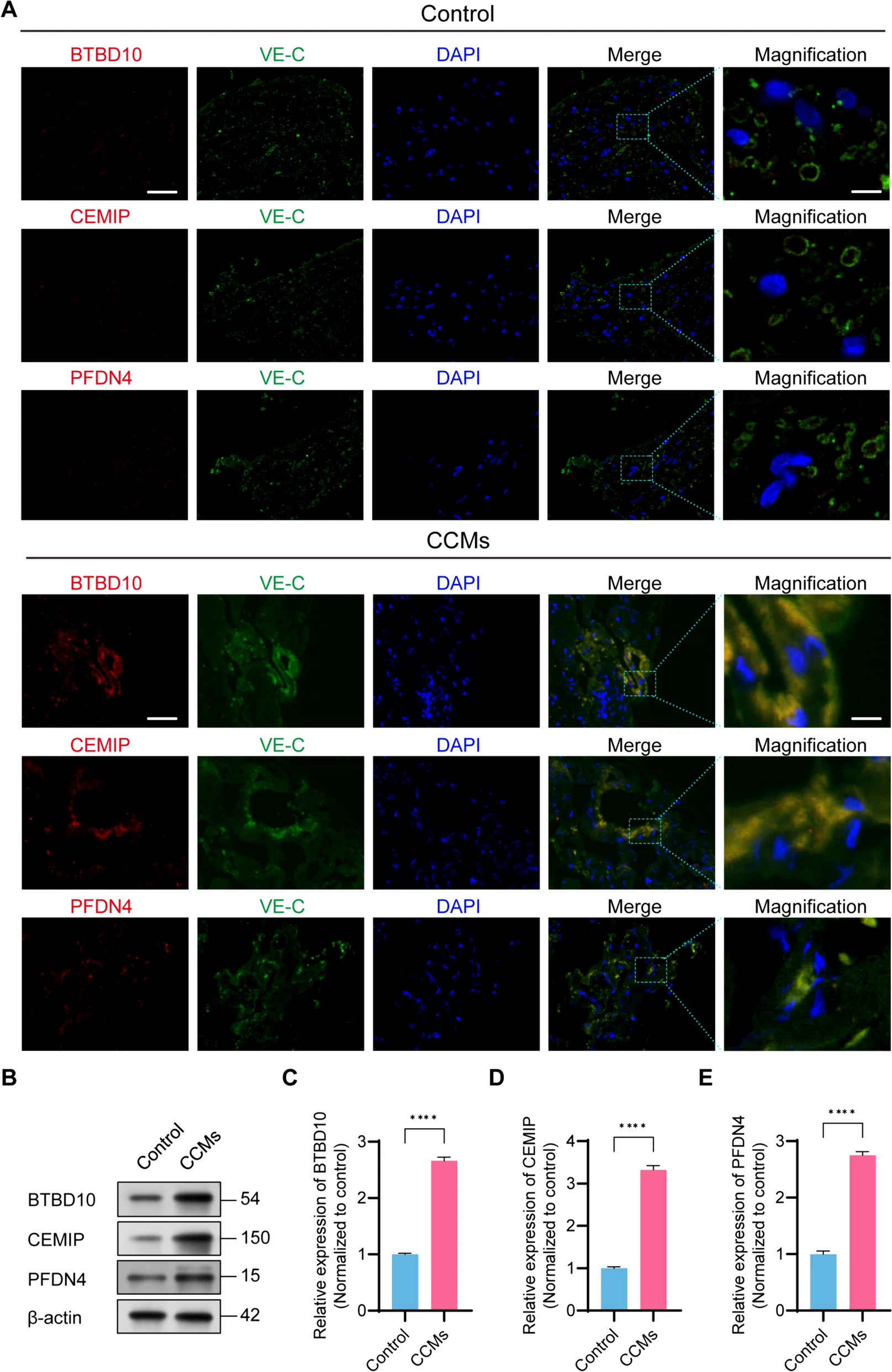 为了进一步确定这三个枢纽基因在CCMs中的实际表达情况,我们在HS队列收集的CCMs样本中进行了免疫荧光共定位并评估了蛋白表达水平(图8A)。与对照组相比,CCMs组中BTBD10、CEMIP和PFDN4的水平显著升高,这表明这些枢纽基因在CCMs组织中的功能表达(图8B-E)。