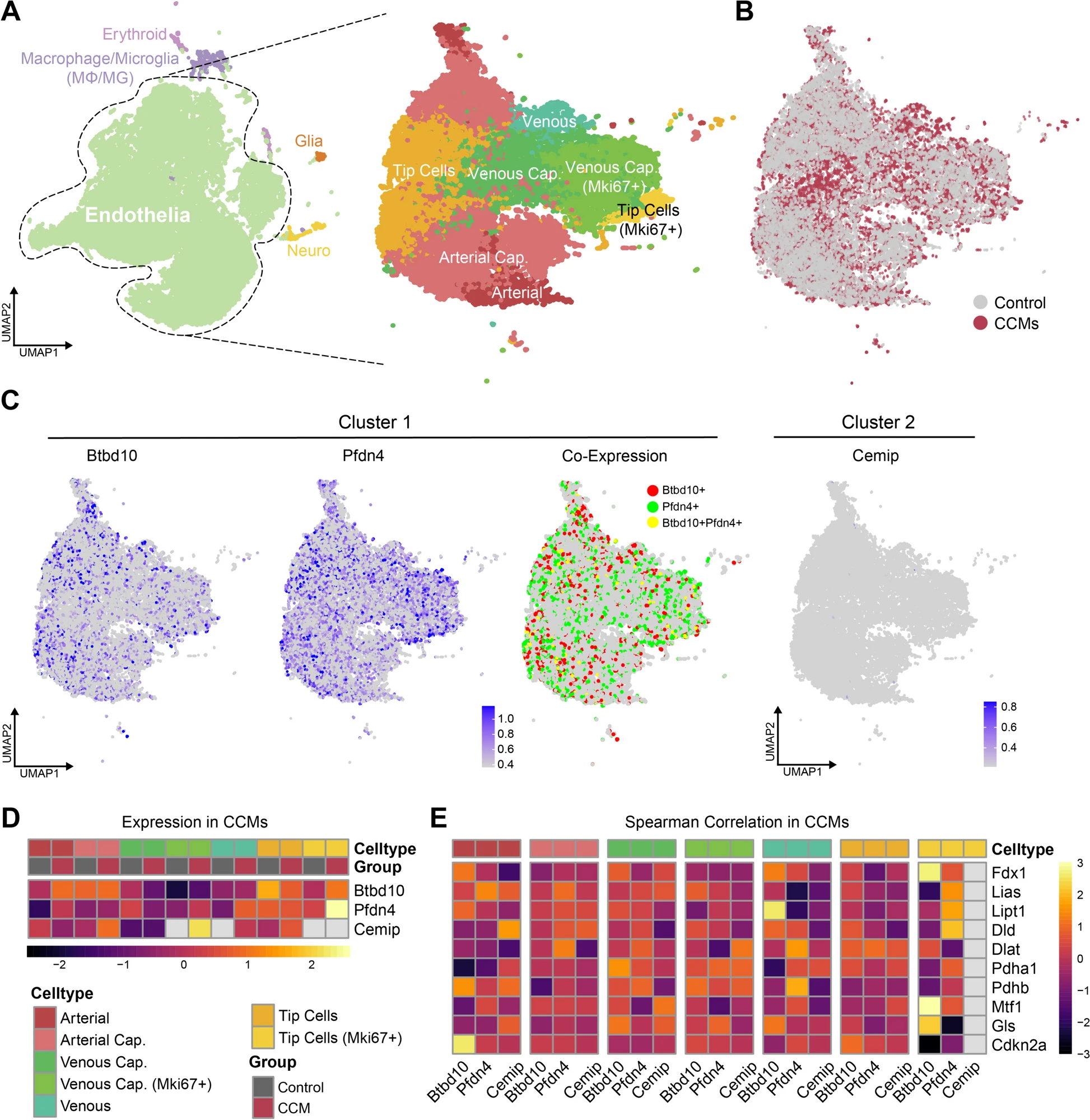 从scRNA-seq数据集(GSE155788)中共获得四个样本(两个正常样本和两个CCMs样本)进行分析。这些细胞被分为五种主要细胞类型,包括红细胞、MΦ/MG、神经胶质细胞、内皮细胞和神经细胞(图9A)。根据已知标记,选择内皮细胞细分细胞亚群,共鉴定出七个内皮细胞群,包括动脉、动脉毛细血管、静脉毛细血管、静脉毛细血管(Mki67+)、静脉、顶端细胞和顶端细胞(Mki67+)(图9B)。随后的共表达分析表明,群组1中的Btbd10和Pfdn4在CCMs的多个EC中重叠(图9C)。证明了它们在细胞水平的高水平共表达。群组2的Cemip在CCMs细胞群中的总体表达水平相对较低。亚组分析显示,Btbd10和Pfdn4在pointed end细胞(Mki67+)中的表达量较高(图9D)。Btbd10在动脉中高表达,而Pfdn4在静脉、静脉毛细血管(Mki67+)和动脉毛细血管中高表达。Cemip在静脉毛细血管(Mki67+)、顶端细胞和动脉毛细血管中高表达,尤其是在静脉系统中。随后,对CCMs不同细胞亚群中的中枢基因和CRGs进行了相关性分析,结果表明这三个中枢基因和CRGs之间的关系是异质性的(图9E)。