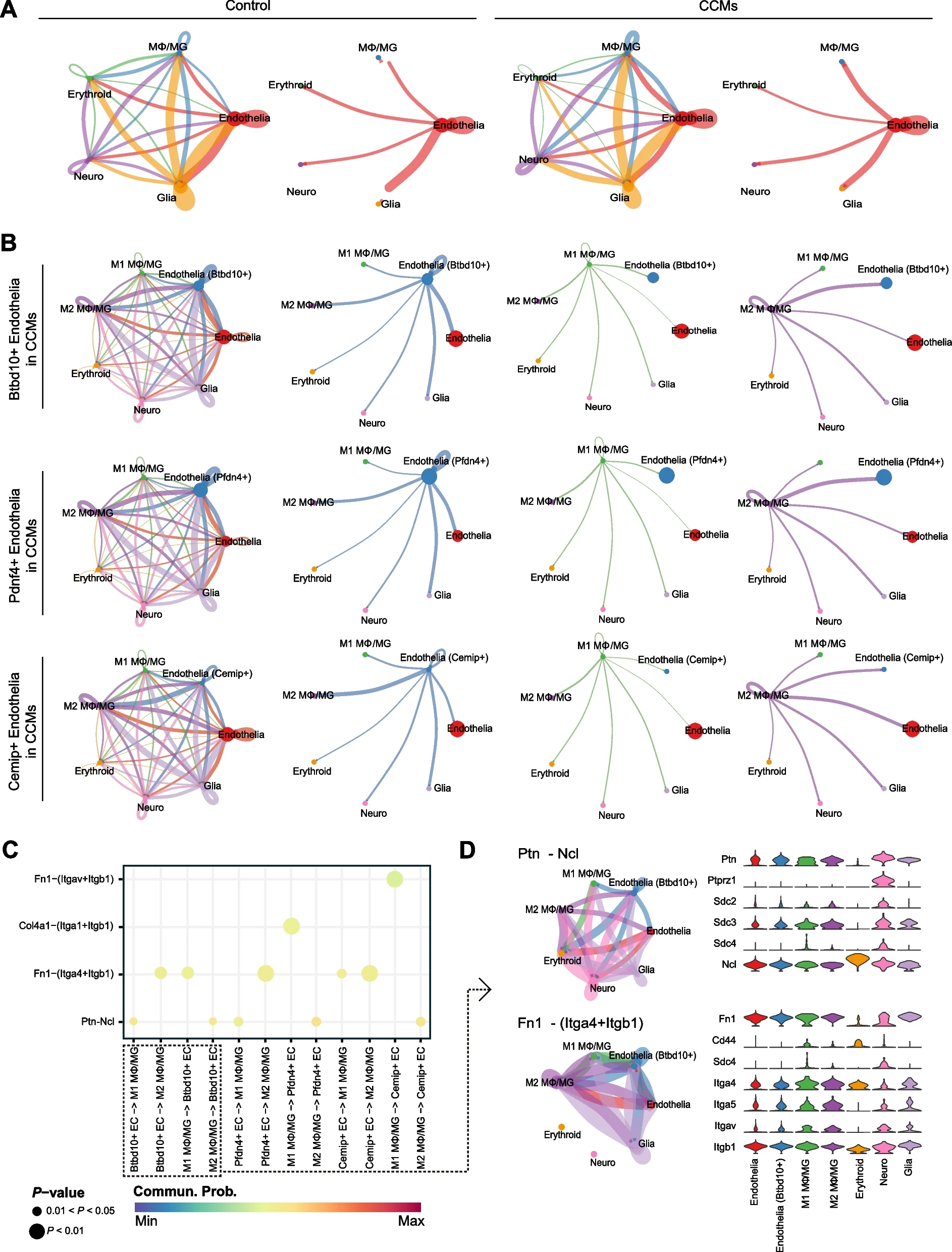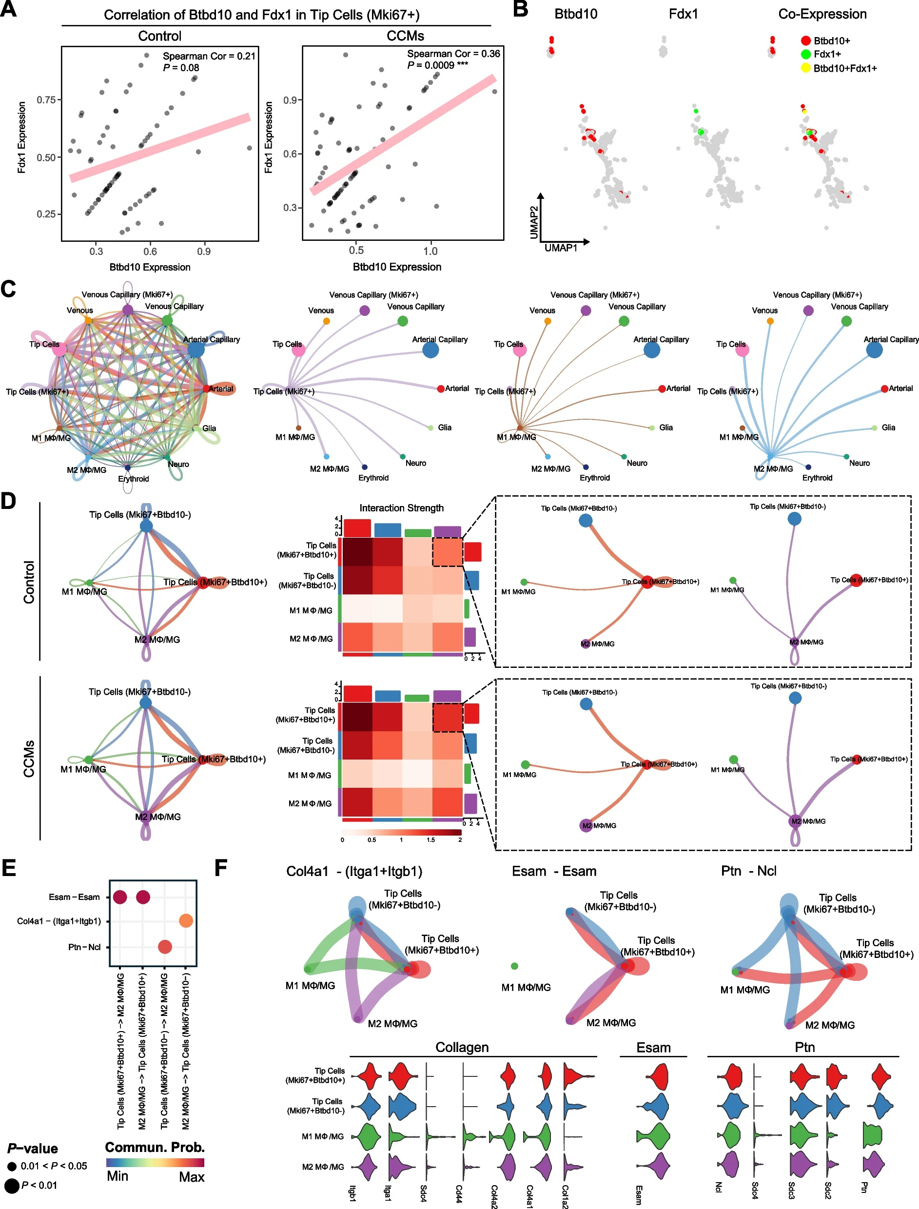 接下来的目标是研究Btbd10在内皮细胞中的高表达是否与CCMs中细胞间通讯的改变相吻合。为此,使用CellChat分析scRNA-seq数据中的细胞间通讯。(图10A)。MΦ/MG与大多数其他细胞之间的细胞-细胞相互作用强度显著增强,尤其是MΦ/MG与内皮细胞之间,这与我们在大量RNA-seq数据集中的观察结果一致(图2H)。随后,将MΦ/MG分成两个亚群,即M1和M2,以探讨它们与CCMs样本中高表达枢纽基因的内皮之间的相互作用(图10B)。M2MΦ/MG与Btbd10+内皮细胞和Pfdn4+内皮细胞之间的相互作用强度强于其他细胞,表明这两个内皮亚群可能在与M2MΦ/MG的相互作用中发挥主要功能作用。这一发现与作者在大量RNA-seq数据中的分析结果一致(图5D-F)。然而,M2MΦ/MG与Cemip+与所有内皮细胞相比,Cemip+内皮细胞与M2MΦ/MG之间的相互作用较弱,这表明Cemip+内皮细胞与M2MΦ/MG之间的相互作用可能不是主要的功能性相互作用。具有高表达中枢基因的内皮细胞和MΦ/MG之间有很大可能主要通过多养蛋白(Ptn)与核蛋白(Ncl)的结合以及fbronectin(Fn1)与整合素alpha4(Itga4)和整合素a1(Itgb1)的结合进行交流(图10C)。考虑到Bdbt10与几个内皮亚群的CRGs之间的正相关性(图9),Bdbt10与内皮亚群的CRGs之间的正相关性(图10E)。我们接着探讨了Btbd10+内皮细胞与MΦ/MG之间显著的相互作用路径(图10D)。在MΦ/MG和Btbd10+内皮细胞之间的相应连接对中,相应信号通路的受体和配体的表达也有所增加(图10D)。由于Btbd10在顶端细胞(Mki67+)中的高表达量,Btbd10在顶端细胞(Mki67+)中的高表达量(图10D)。作者试图在内皮细胞的相关细胞亚群中探索并验证Btbd10与铜死亡- Fdx1之间的相关性。随后,分析了Btbd10与Fdx1之间的关系(图11A)。结果显示,在CCMs样本的pointed end细胞(Mki67+)中,Btbd10与Fdx1呈显著正相关,而在对照组中则无明显相关性。进一步的共定位结果也暗示了Btbd10和Fdx1在pointed end细胞(Mki67+)群体中的共表达(图11B)。M2MΦ/MG,有明显的相互作用强度(图11C)。同时,与顶端细胞相比在Btbd10低表达的pointed end细胞(Mki67+)与M2MΦ/MG之间,观察到相互作用强度显著增加(图 11D)。Bdbt10高表达或低表达的M2MΦ/MG和pointed end细胞(Mki67+)之间的配体-受体途径,发现它们主要通过Esam(上皮细胞-裂隙粘附分子)-Esam、Col4a1-(Itga1+Itgb1)(胶原Ⅳ型α1链-(与integ-rina1相互作用)+Itgb1)和Ptn-Ncl配体途径相互作用(图11E)。M2MΦ/MG与pointed end细胞(Mki67+Btbd10-)之间的相互作用主要通过Col4a1-(Itga1+Itgb1)和Ptb-Ncl进行(图11F)。这些结果表明,M2MΦ/MG可能通过上述配体-受体途径与顶端细胞(Mki67+)相互作用,并驱动顶端细胞(Mki67+)的铜死亡,从而对CCMs的进展产生潜在影响。