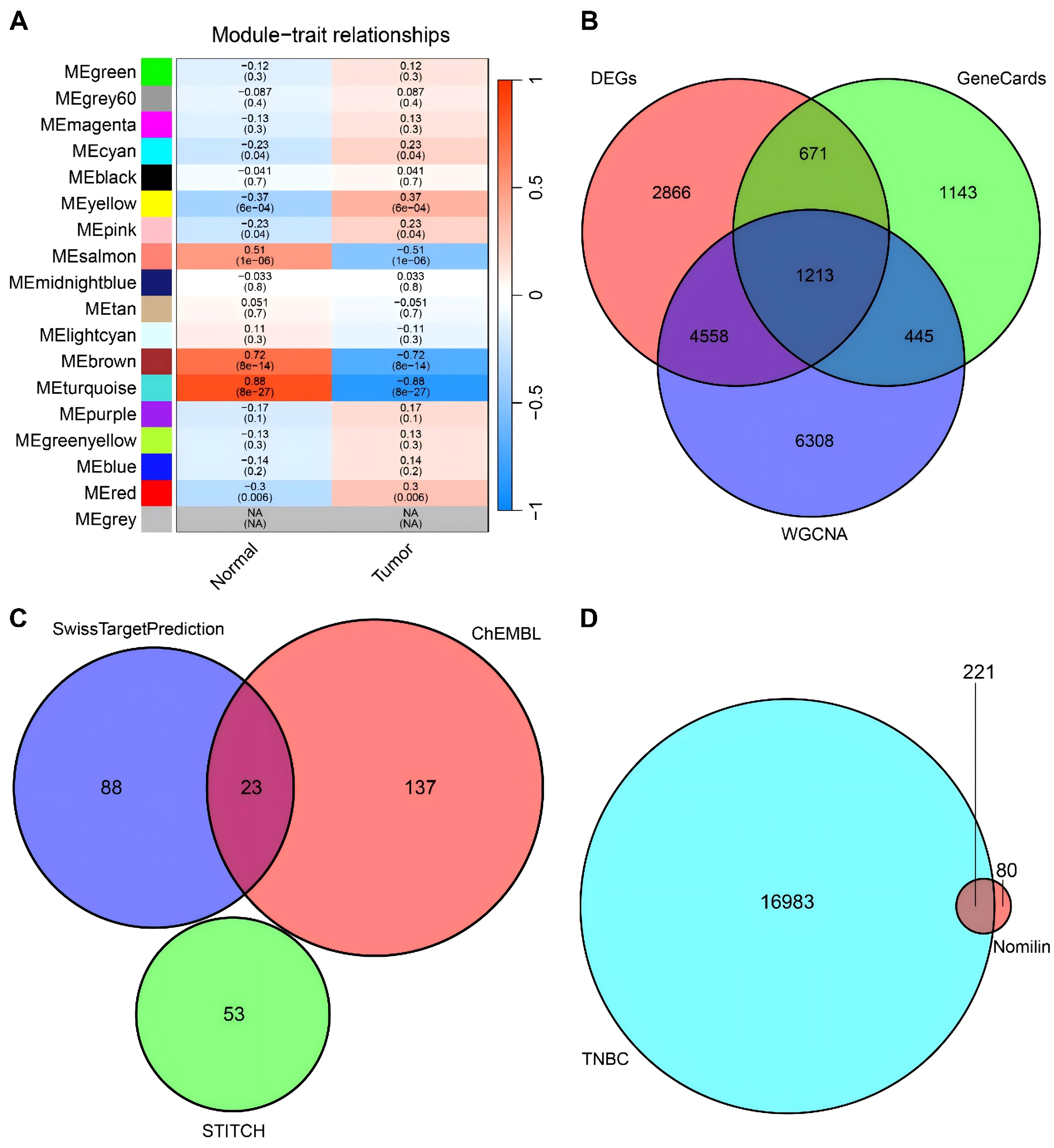对TNBC队列样本进行了差异表达分析,共获得9308个DEGs。WGCNA分析确定了TNBC肿瘤特征的特定模块,其中MEturquoise模块与TNBC肿瘤表型的相关性highest,从该模块中提取了12524个基因(图1A)。然后,从GeneCards数据库中筛选出3472个与TNBC相关的潜在靶点。将三种分析方法得到的潜在靶点组合成一个维恩图(图1B),共得到17204个TNBC潜在靶点。随后,利用Swiss Target Prediction、ChEMBL和STITCH数据库,确定了301个诺米林的潜在靶标(图1C)。将301个诺米林靶点与17204个TNBC相关潜在靶点进行交叉分析,发现有221个交叉点为诺米林针对TNBC的潜在靶点(图1D)。此外,还利用Cytoscape构建了诺米林抗TNBC的药物-靶点-疾病网络。