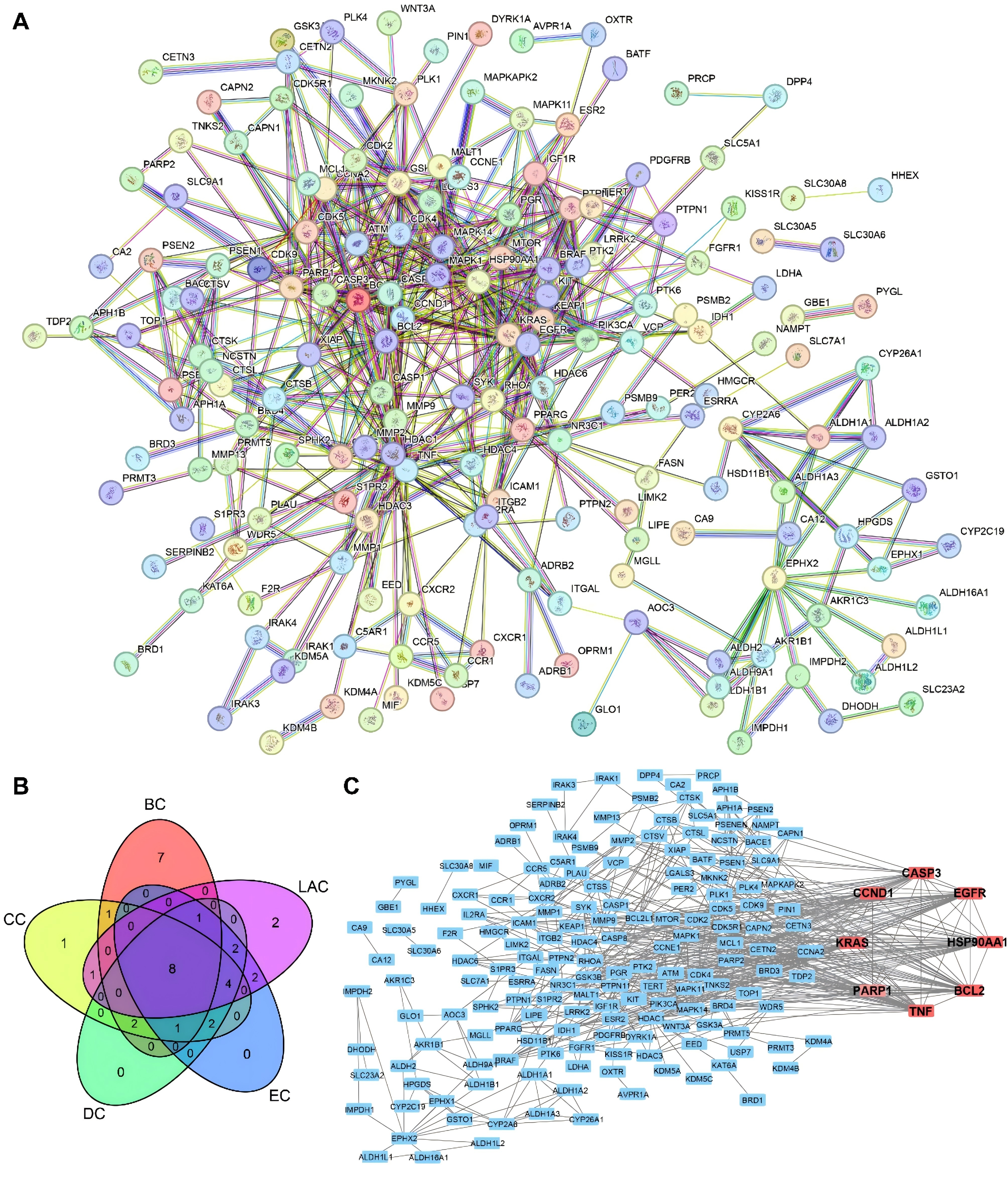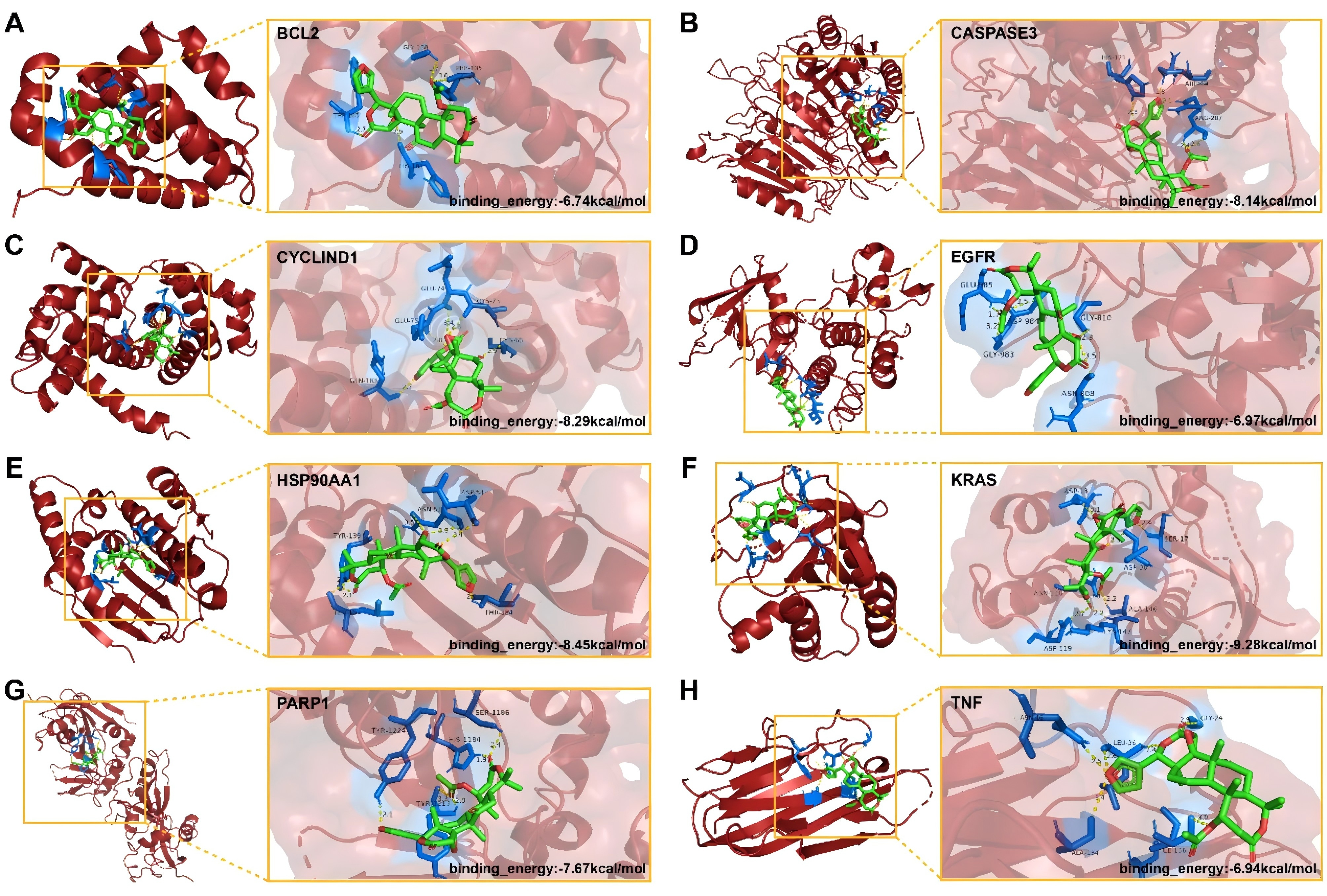 为了确定诺米林对TNBC的主要作用,利用String数据库构建了一个由219个节点和562条边组成的PPI网络(图2A),共确定了8个核心靶标:BCL2、Cas-pase3、CyclinD1、表皮生长因子受体、HSP90AA1、KRAS、PARP1和TNF(图2B)。图2C描述了八个核心靶标与其他靶标之间的蛋白质相互作用网络。