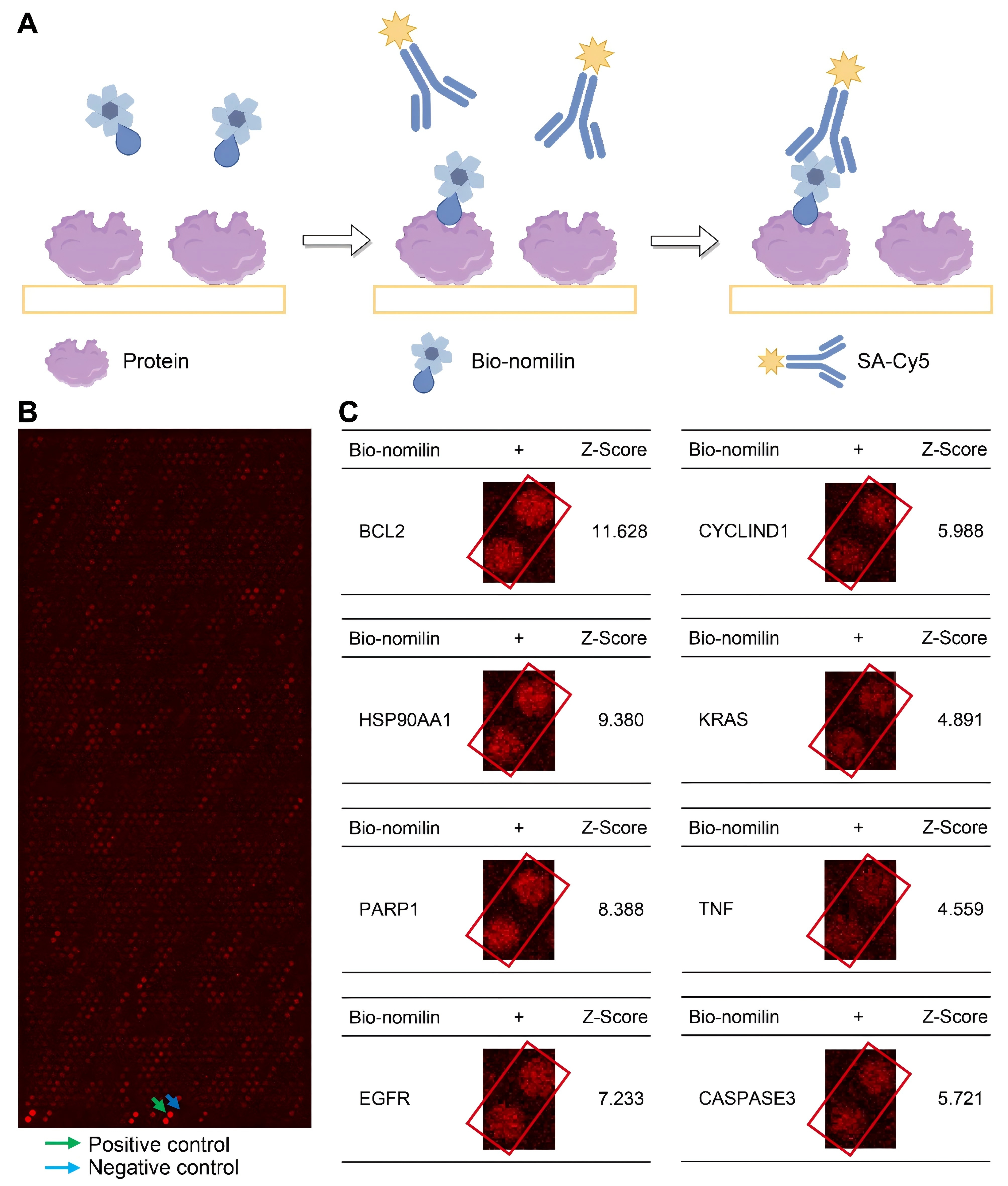 作者使用了包含约20000个人类全长蛋白质的蛋白组芯片,来评估诺米林与核心靶标的结合亲和力,并用Cy5-SA对由此产生的结合情况进行可视化检测(图4A)。图4B显示了结果的一个子集,图4C则提供了描述诺米林与其核心靶标相互作用的放大图像。结果表明,诺米林与其核心靶标之间具有很强的结合亲和力。
