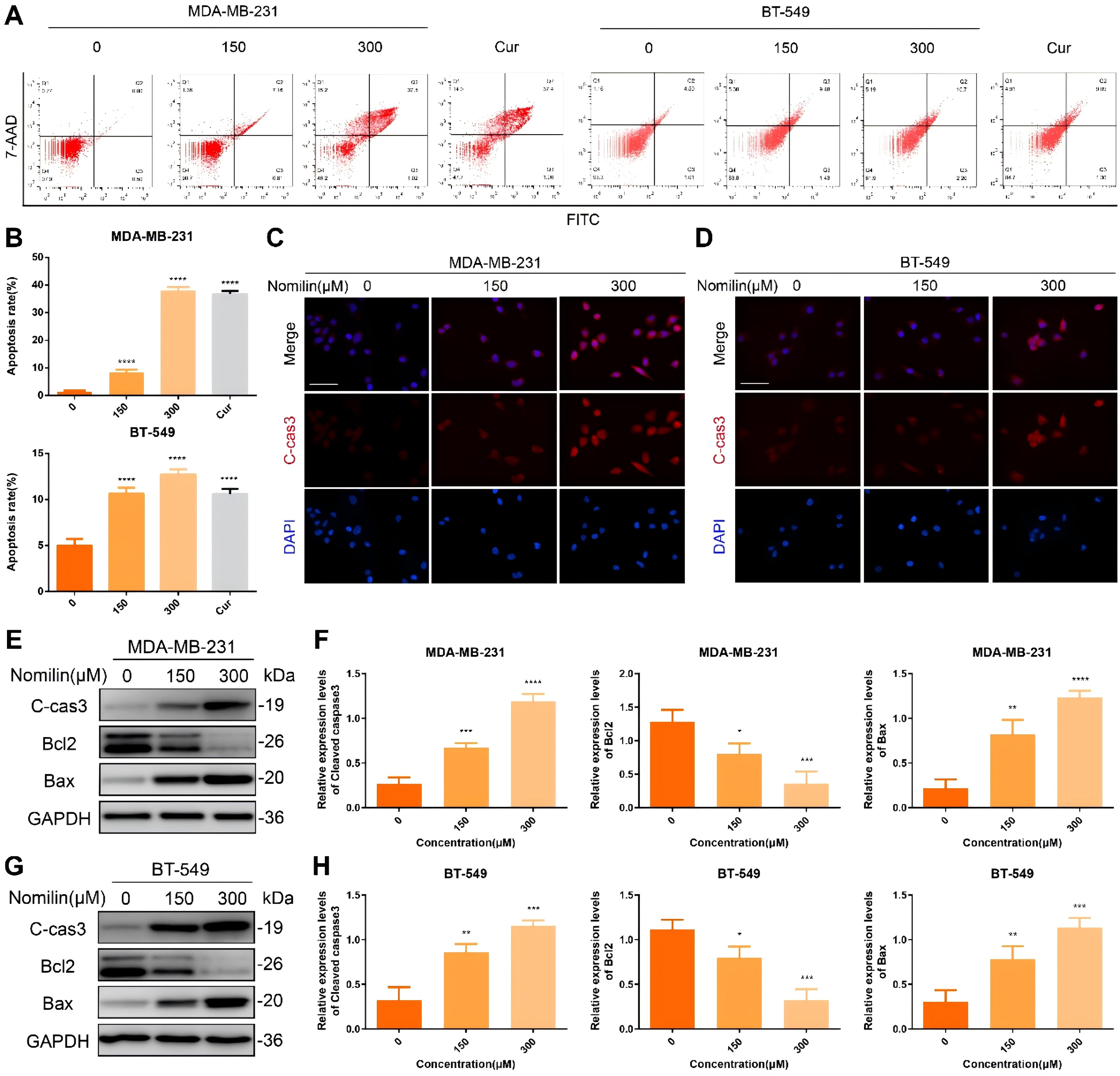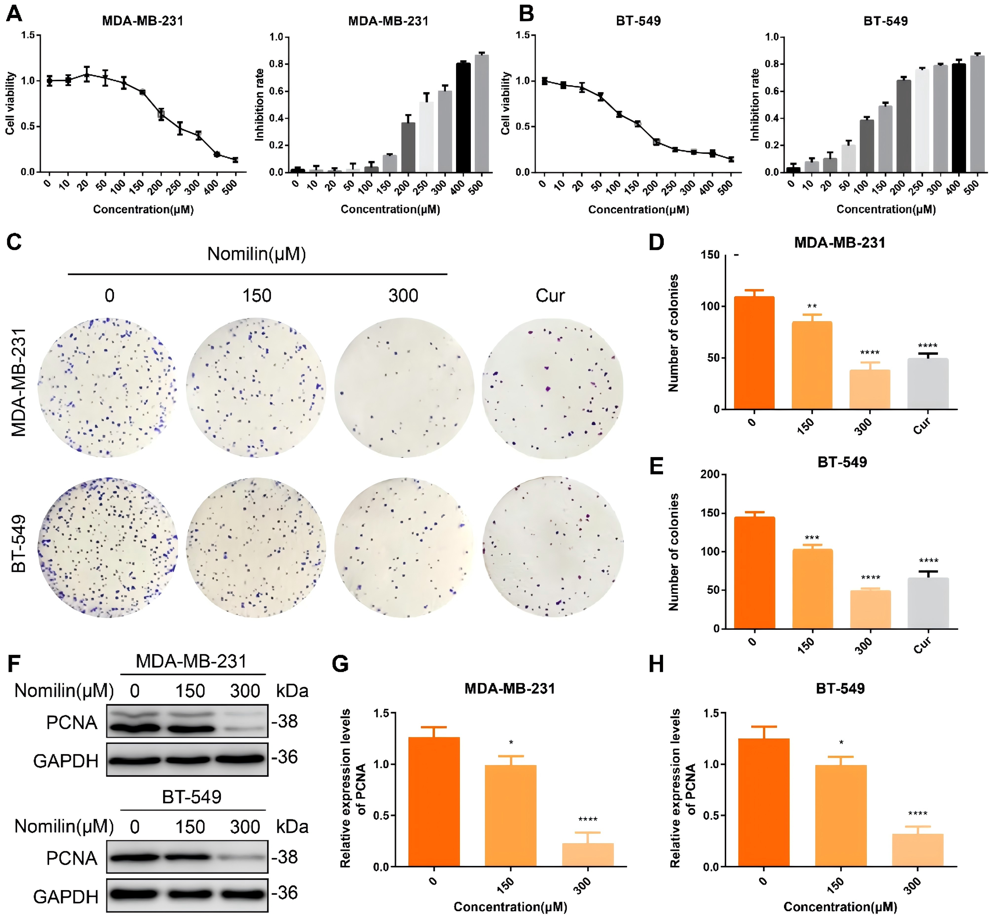 为了评估诺米林抑制TNBCCs的细胞增殖潜力,利用CCK-8测定了不同浓度的诺米林处理后TNBCCs的细胞通透性。图6A-B所示的结果表明,诺米林对TNBCCs增殖的抑制作用呈浓度依赖性。根据CCK-8的结果,选择150 μM和300 μM的浓度进行进一步的实验验证。姜黄素(80 μM)用作阳性对照。克隆形成试验表明,与对照组相比,用150 μM和300 μM的诺米林处理后,TNBCCs菌落数明显减少(图6C-E)。Western印迹分析以评估TNBC细胞中增殖细胞核抗原(PCNA)的表达。如图7F-H所示,诺米林显著抑制了TNBCCs中PCNA的表达。这些结果共同表明,诺米林可以剂量依赖性地抑制TNBCCs的增殖。