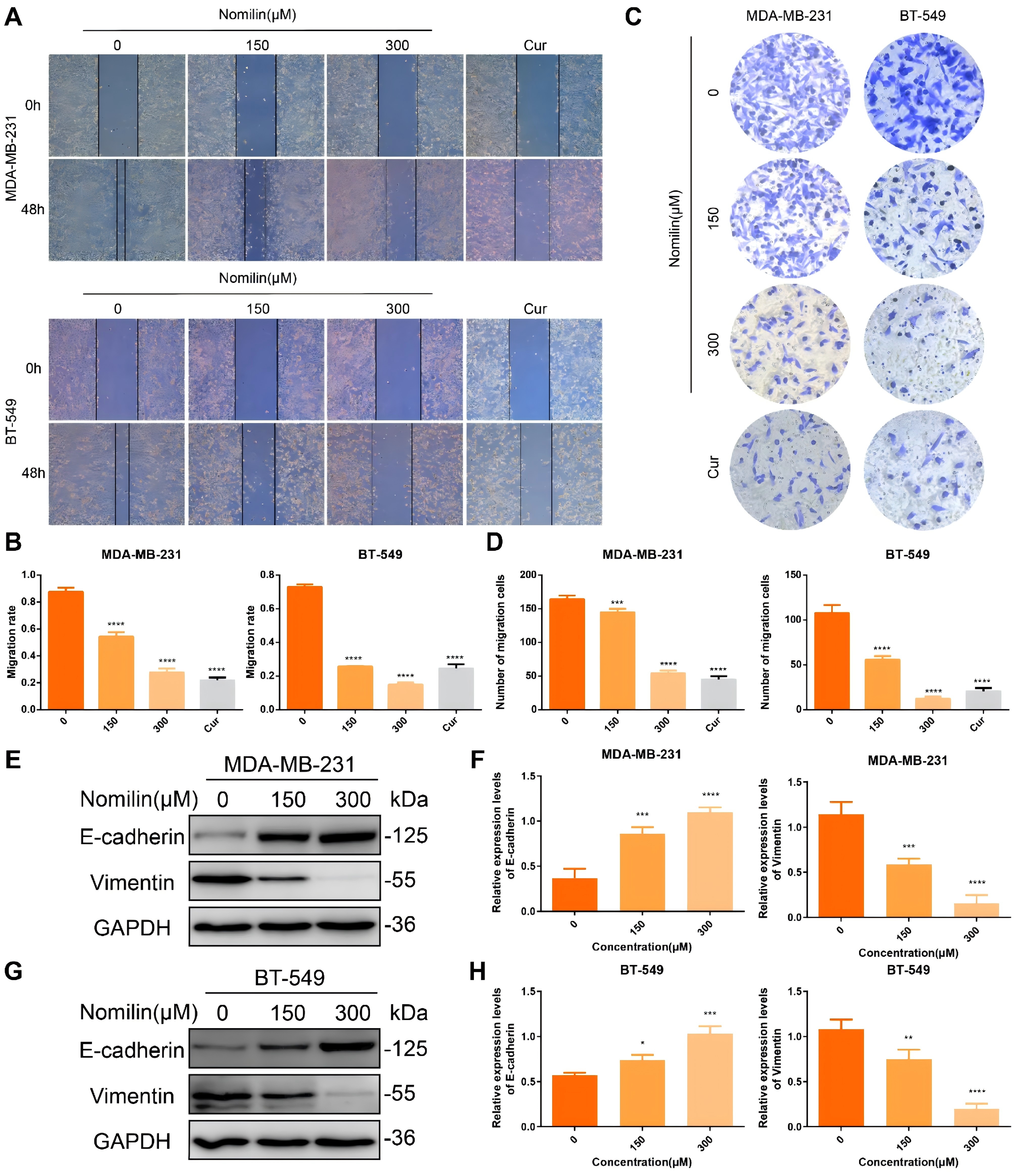 作者进行了伤口愈合和Transwell试验,以研究诺米林对TNBCCs迁移的潜在抑制作用。图7A-D表明,未经处理的MDA-MB-231和BT-549细胞显示出很强的迁移能力,而诺米林处理则会显著抑制这些细胞株的迁移,而且迁移能力的强弱与浓度有关。此外,还为了观察到的诺米林对TNBC迁移的抑制作用是否与上皮-间质转化(EMT)有关,使用诺米林后评估了EMT标记蛋白的水平。图7E-H描述了WB结果,显示由于诺米林的显著作用,E-cadherin明显上调,Vimentin下调。综上所述,这些研究结果表明,诺米林可通过抑制EMT来减轻TNBCCs的迁移。