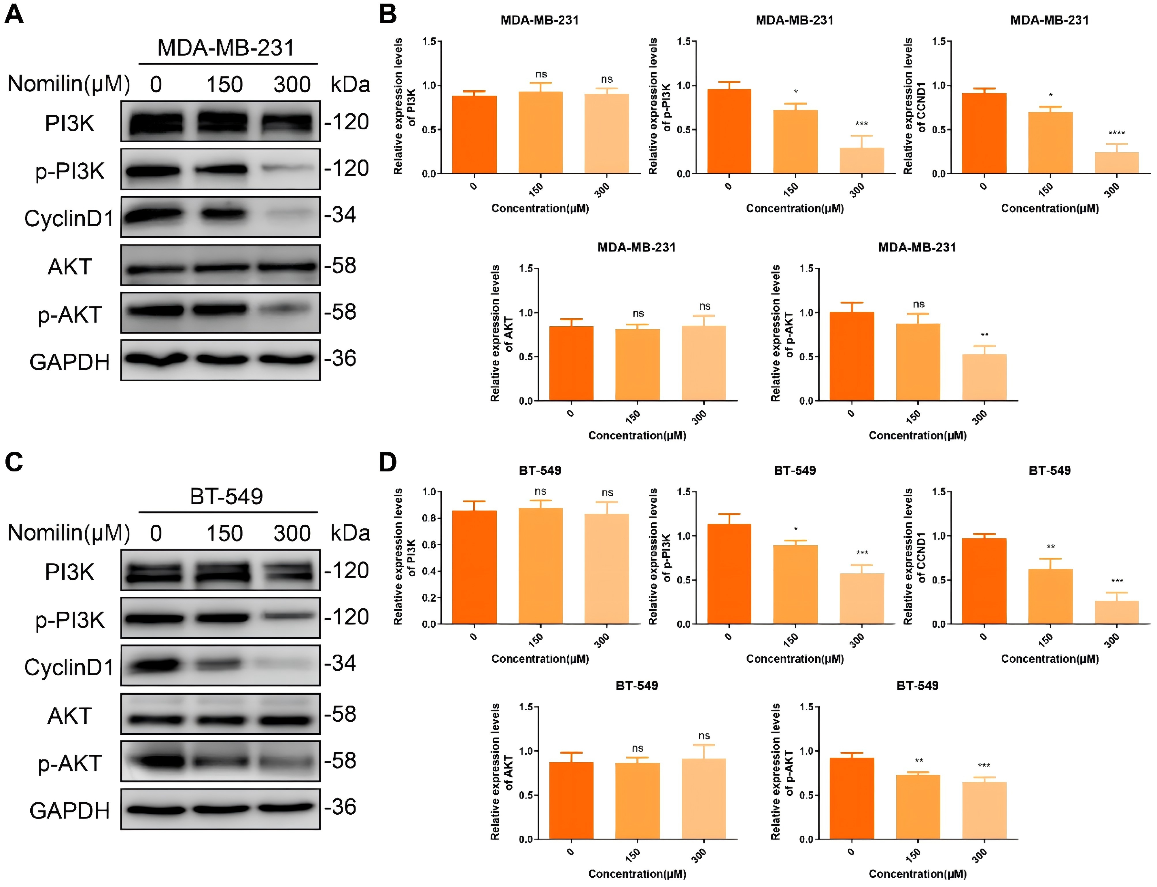 KEGG的研究结果表明,诺米林可能通过介导PI3K/Akt通路对抗肿瘤坏死细胞产生重要影响。随后,对诺米林在调节PI3K/Akt通路中的作用进行了全面研究。定量WB分析显示,诺米林可降低TNBCCs中p-PI3K和p-Akt的表达,而PI3K和Akt的表达则不受影响(图9A-D)。Akt能够使mTOR磷酸化,从而促进细胞周期蛋白CyclinD1的上调,并促进从G1期向S期的过渡。因此,作者评估了诺米林对CyclinD1表达的影响。与网络药理学发现一致,WB结果显示诺米林有效地抑制了CyclinD1的表达。综合这些实验结果,证实了诺米林通过PI3K/Akt/CyclinD1通路发挥其抗TNBC效应。