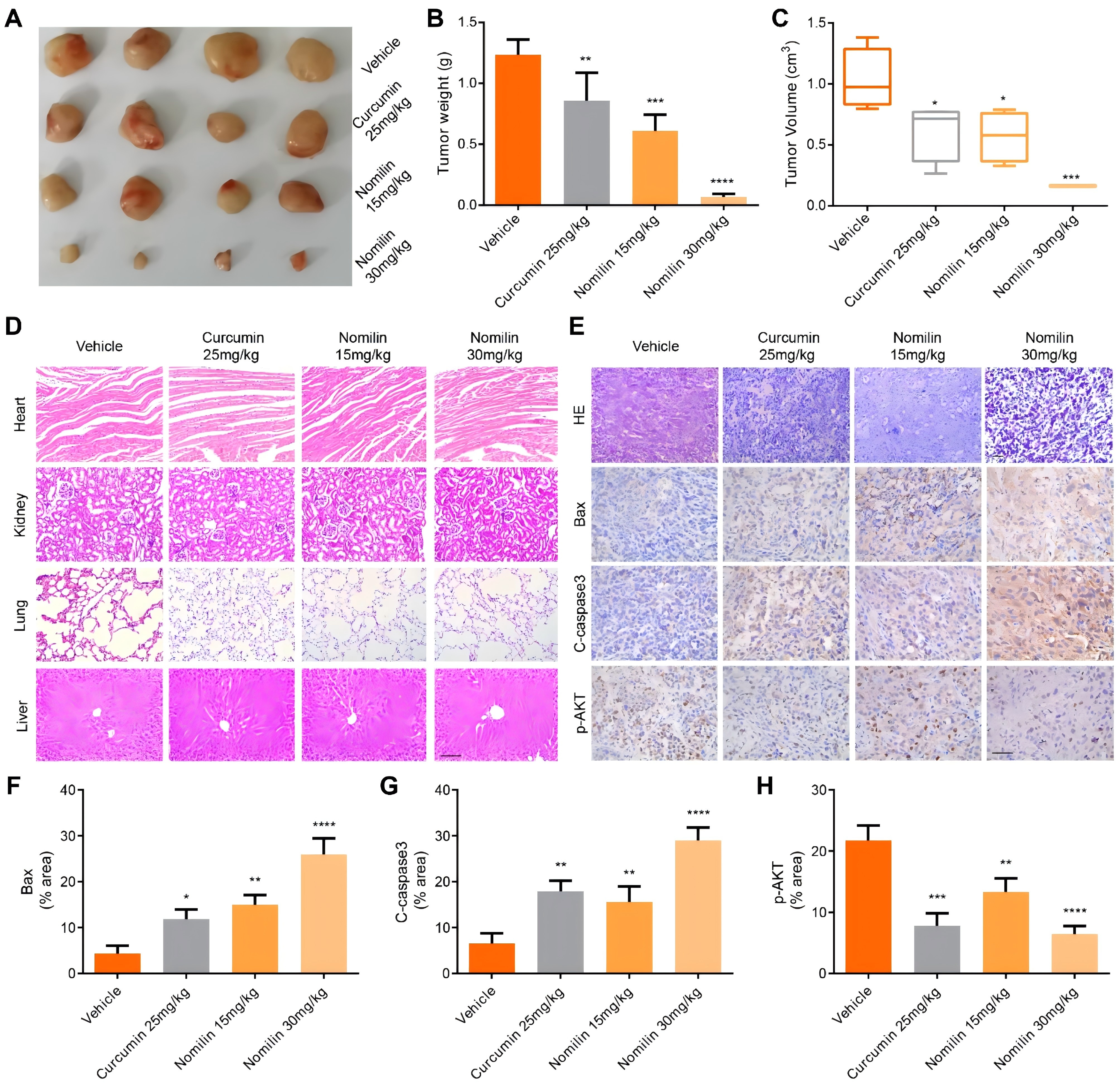 如图10A-C所示,与对照组相比,经诺米林治疗的裸鼠的肿瘤体积和质量明显缩小。此外,经HE染色证实,诺米林没有明显毒性(图10D)。肿瘤组织的H&E染色显示肿瘤细胞增殖受到抑制(图10E)。此外,体外实验结果表明,诺米林可上调BAX和裂解-Caspase3的表达,表明诺米林可通过线粒体依赖途径诱导肿瘤细胞凋亡(图10E-G)。从机理上讲,免疫组化结果表明,诺米林降低了p-Akt的水平(图10H)。总之,这些研究结果表明,诺米林可有效抑制体内肿瘤的生长,并具有良好的安全性。