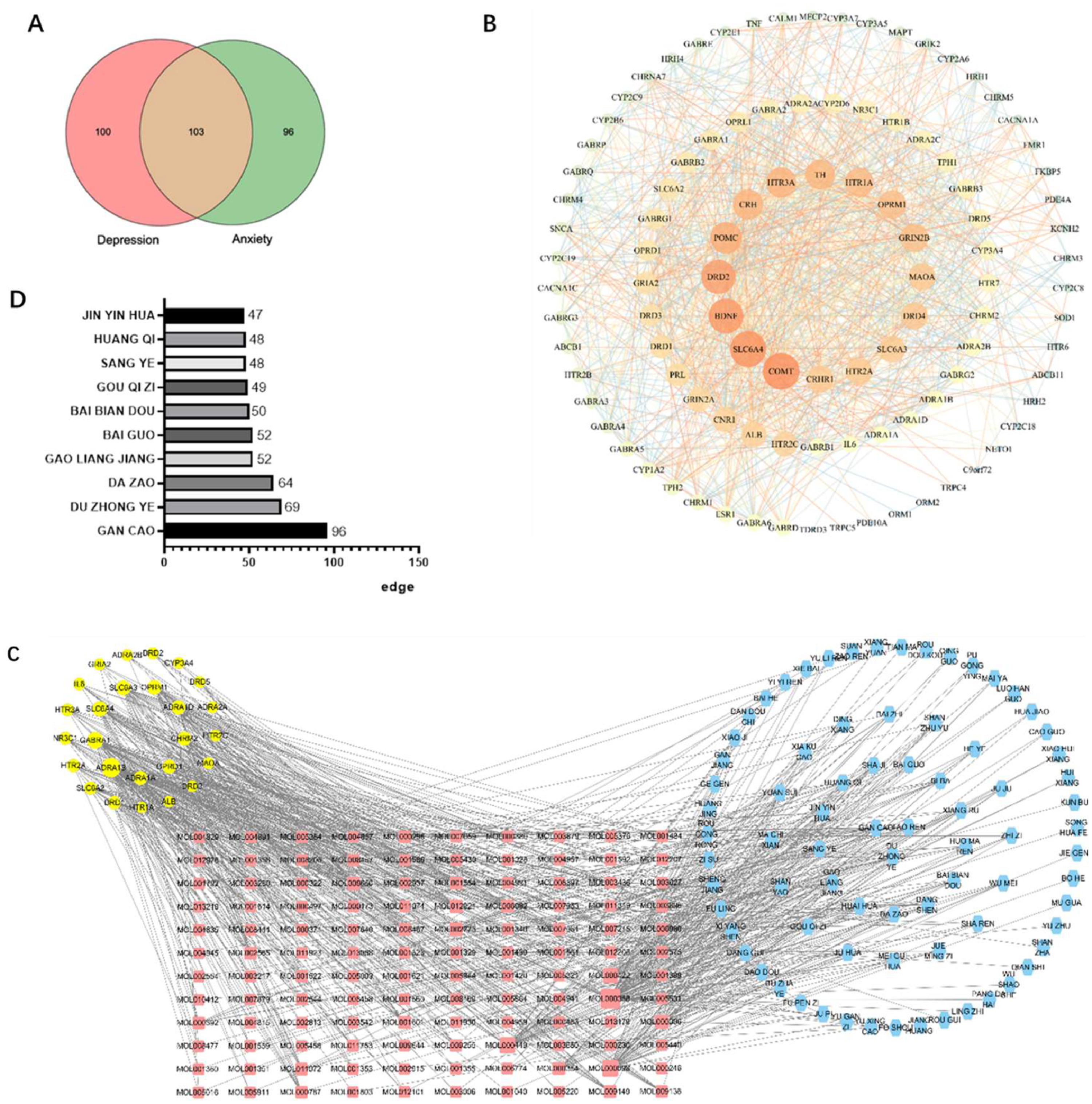 通过数据库搜索共确定了103个交叉靶标(图2A),构建了一个PPI网络(图2B)。其中,度值在22或以上的49个节点被认定为本研究的核心靶点。随后生成了"焦虑和抑郁靶点-活性成分-同源草药"网络(图2C)。在49个靶标中,有26个可以与120种活性成分负匹配,相当于来自同一来源的79种草药。采用直接拓扑分析计算中药材节点及其相应活性成分的度值之和,确定边缘的数量。选取边值maximum的前10种药材,包括甘草、桑叶等,进行进一步研究(图2D)。