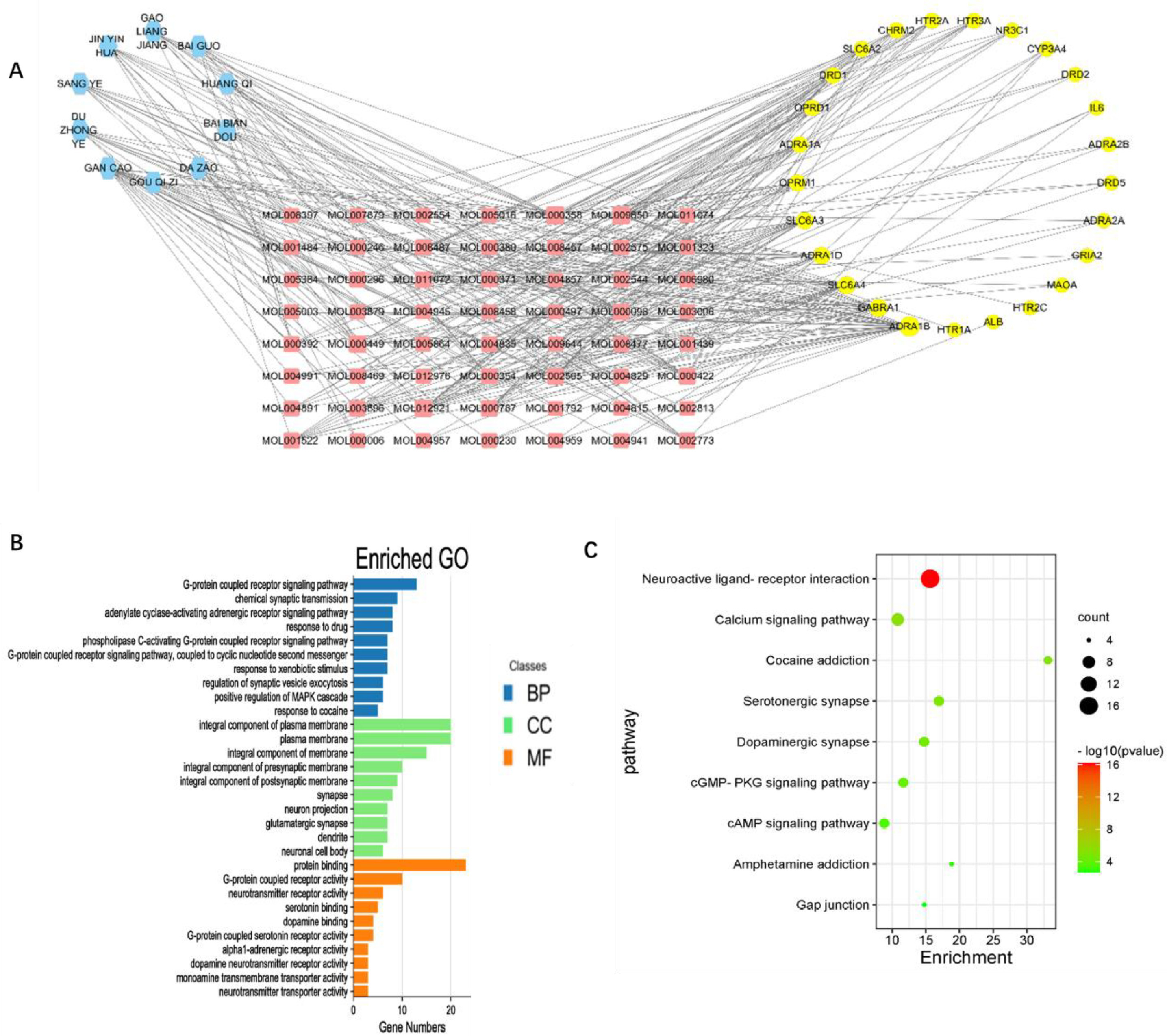 从子网络中提取的十种核心药材被用于构建"核心药材-有效成分-抑郁和焦虑靶点"网络(图3A)。根据富集基因的数量,前十名结果以柱状图显示(图3B)。这些靶标主要与G蛋白偶联受体信号通路和化学突触传递等生物过程有关。在细胞组成方面,它们与细胞质膜组成等方面有关。分子功能则与蛋白质结合、G蛋白偶联受体活性等有关。KEGG富集分析共发现了9条通路,包括神经活性配体-受体相互作用和钙信号通路(图3C)。
