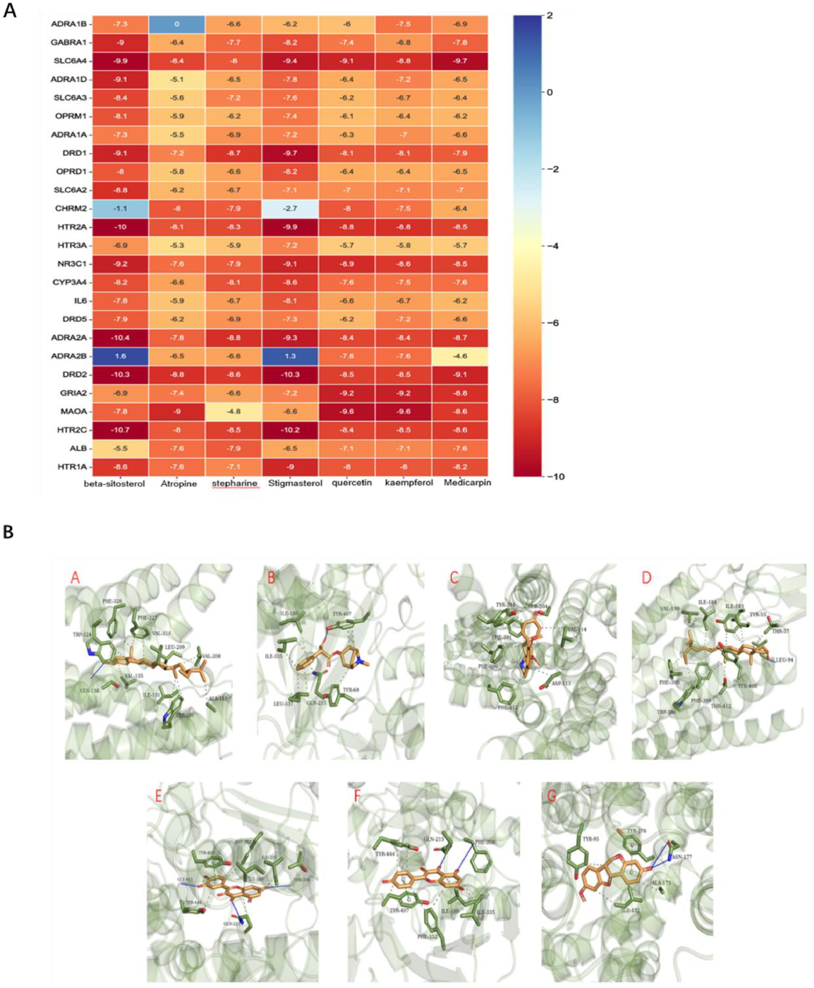 在"核心药用植物-活性成分-抑郁和焦虑靶标"网络中,以25个靶标作为受体蛋白,以主要的7种核心成分作为配体,进行了175次分子对接。一般来说,较小的结合能表明配体与受体之间的结合活性更强。在25个抑郁和焦虑靶点中,大多数都表现出与关键活性成分的良好结合活性(图4A)。其中,β-谷甾醇与HTR2C的结合活性highest,结合能为-10.7 kcal/mol,其次是豆甾醇与DRD2和美迪卡品与SLC6A4。三维图形显示了与目标结合活性the best的活性成分的对接模式(图4B)。