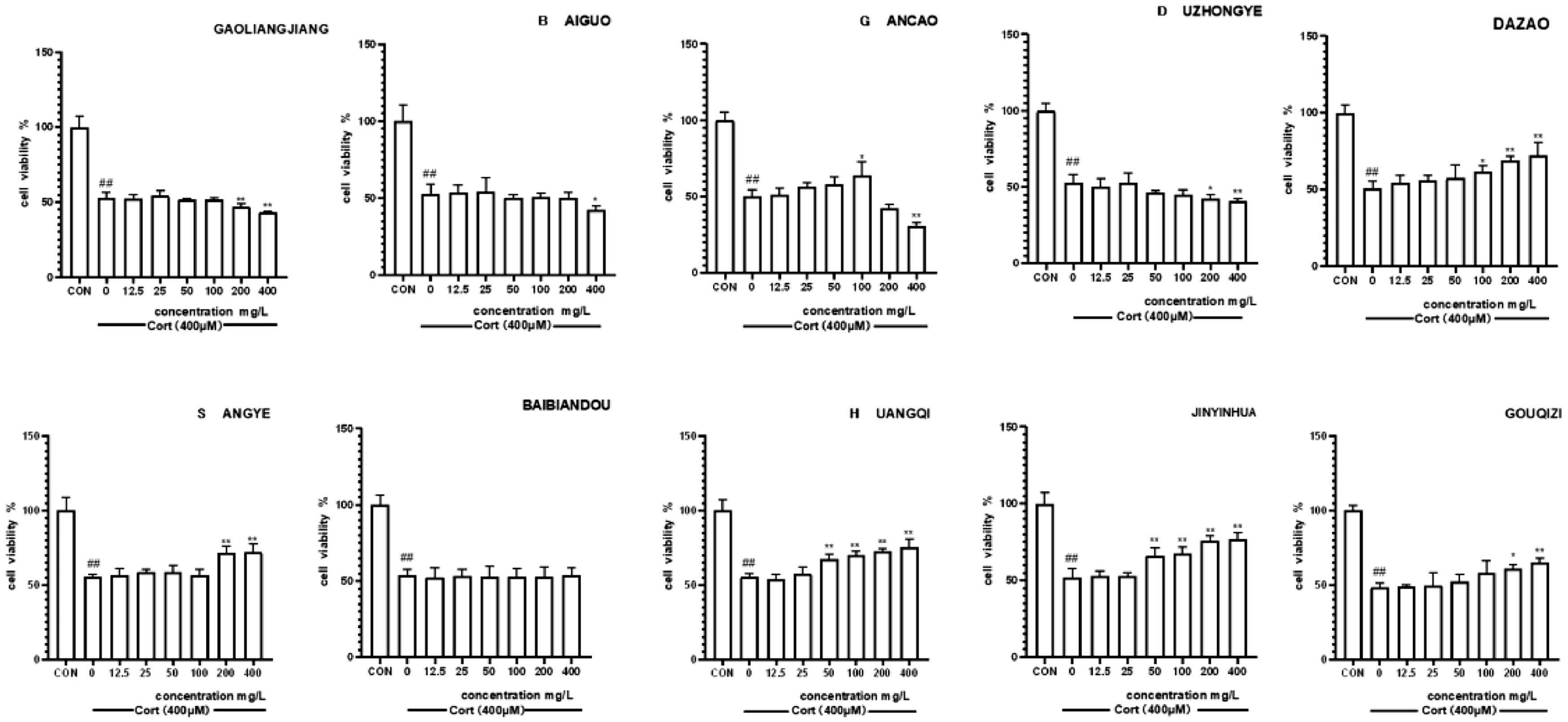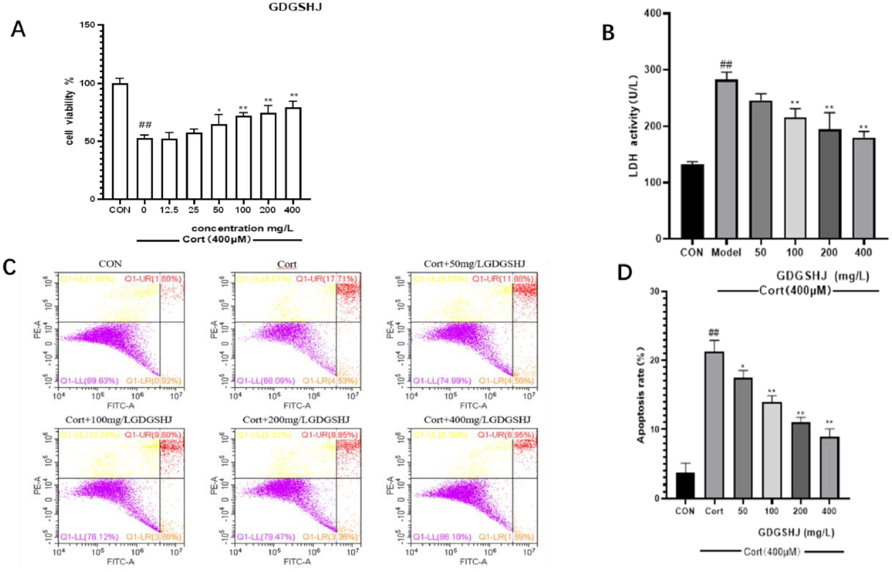 将400μM浓度的皮质酮暴露于PC12细胞24小时后,PC12细胞的增殖率下降了50.80±3.69%,表明细胞受到了严重破坏(图5)。在研究10草药对皮质酮诱导的PC12细胞增值率的影响(图6)。100mg/L甘草干预后的PC12细胞活性为63.93±7.6%。值得注意的是,400mg/L大灶、勾七子、桑烨、黄骐和金银化的干预导致PC12细胞活性分别为72.38±7.04%、65.23±2.48%、72.11±4.63%、75.51±4.67%和75.46±1.73%。相反,独中叶(200和400mg/L)、高梁江(200和400mg/L)和百果(400mg/L)对皮质酮诱导的PC12细胞表现出毒性作用。白编豆在0-400mg/L浓度范围内,对皮质酮处理的PC12细胞无显著影响。在50、100、200和400mg/L的浓度下,GDGSHJ制剂有效逆转细胞损伤,降低LDH活性,改善皮质酮诱导的PC12细胞膜损伤,并以剂量依赖性方式抑制皮质酮诱导的细胞凋亡(图7)。