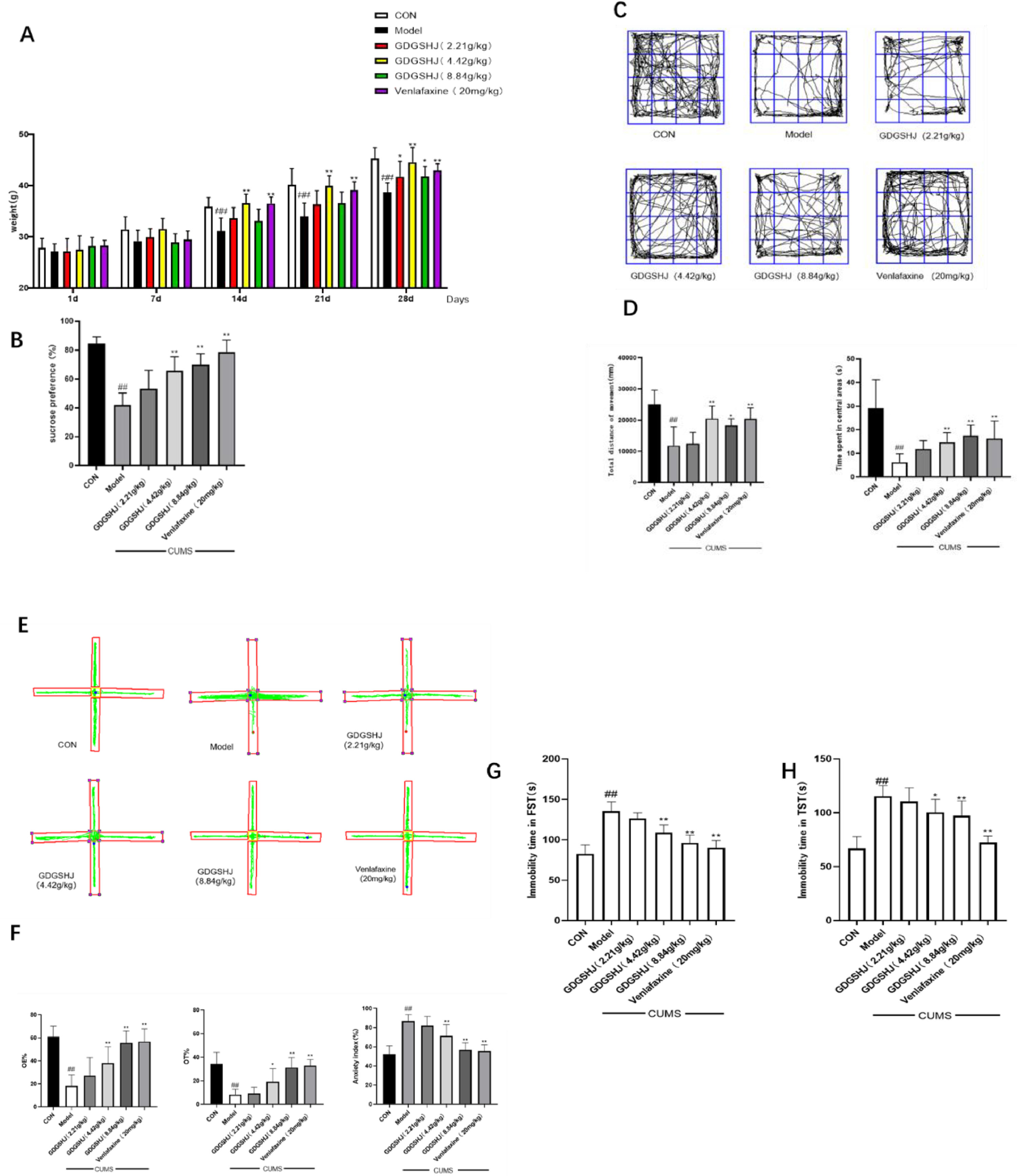 模型制作完成后,模型组小鼠的体重增加明显低于正常组,同时还出现了毛发凌乱。这些症状在中剂量GDGSHJ和文拉法辛组明显逆转。在糖水偏好实验中,模型组小鼠的糖水偏好率(42.04±7.72%)明显低于空白组(84.59±4.36%)。开阔地实验表明,与空白组(25064±4539mm,29.03±12.05s)相比,模型组小鼠在中心区的总行进距离和停留时间(11830±6011mm,6.31±3.57s)均有所减少。EPM结果显示,模型组的焦虑指数(86.80±6.44%)高于正常组(52.39±8.26%)。与正常对照组(82.6±10.57s,66.9±10.49s)相比,模型组的FST和TST显示固定时间延长(135.6±10.76s,115.4±9.43s),表明建模成功。GDGSHJ中剂量组和高剂量组明显逆转了这些情况,表明其具有很强的抗抑郁活性(图8)。