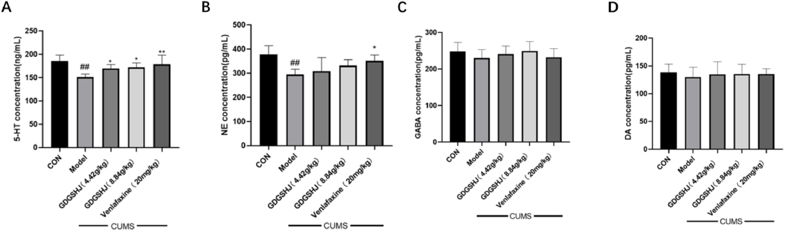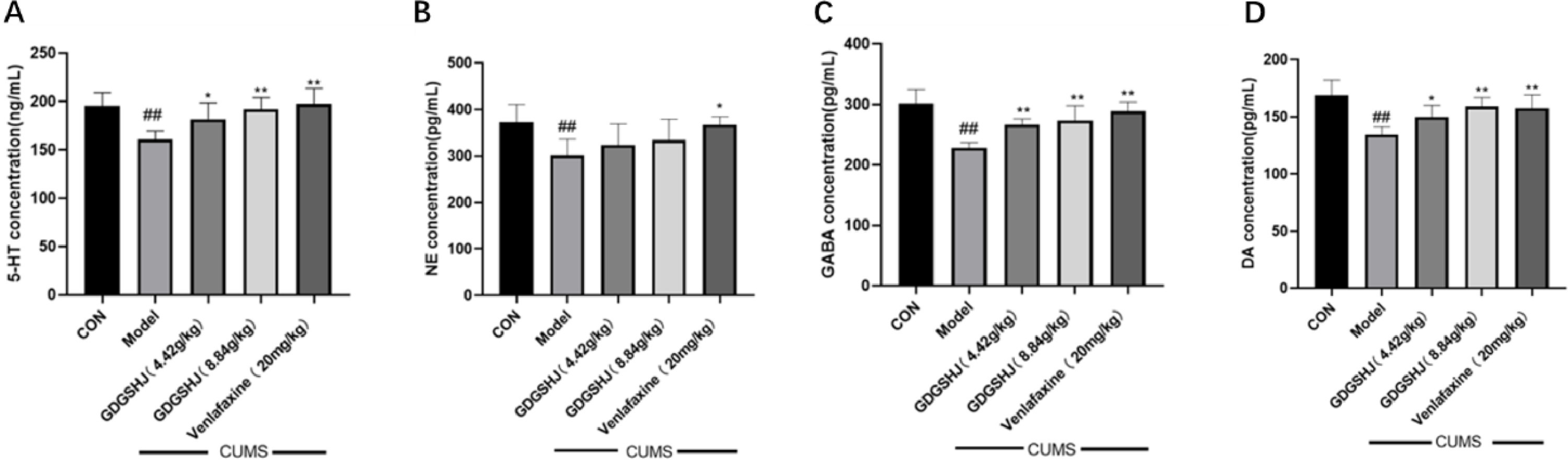 在小鼠神经递质水平方面,空白组的血清中5-HT和NE水平分别为185.75±11.83ng/mL和378.32±32.64pg/mL。CUMS刺激模型组的血清5-羟色胺(150.85±6.38ng/mL)和NE(294.84±20.01pg/mL)水平显著下降。阳性对照药物文拉法辛明显提高了血清5-HT和NE的水平。同时,中、高剂量的GDGSHJ对血清5-HT水平有明显调节作用,但对NE水平无明显影响。虽然有明显的趋势,但CUMS小鼠的血清GABA和DA与空白对照组没有明显差异(图9)。在脑组织中,空白组的5-HT、NE、GABA和DA水平分别为195.39±12.88ng/mL、372.03±36.08pg/mL、301.06±21.92pg/mL和301.06±21.92。pg/mL和168.45±12.70pg/mL。模型组在接受CUMS刺激后,5-HT(160.64±8.27ng/mL)、NE(301.26±32.57pg/mL)、GABA(228.34±7.53pg/mL)和DA(134.43±6.30pg/mL)明显下降。使用阳性药物文拉法辛可逆转这些效应,导致脑组织中的5-羟色胺、GABA和DA含量增加。同样,与CUMS组相比,中剂量和高剂量GDGSHJ均能显著提高脑组织中5-羟色胺、GABA和DA的含量。然而,GDGSHJ对脑组织中NE的影响不明显(图10)。