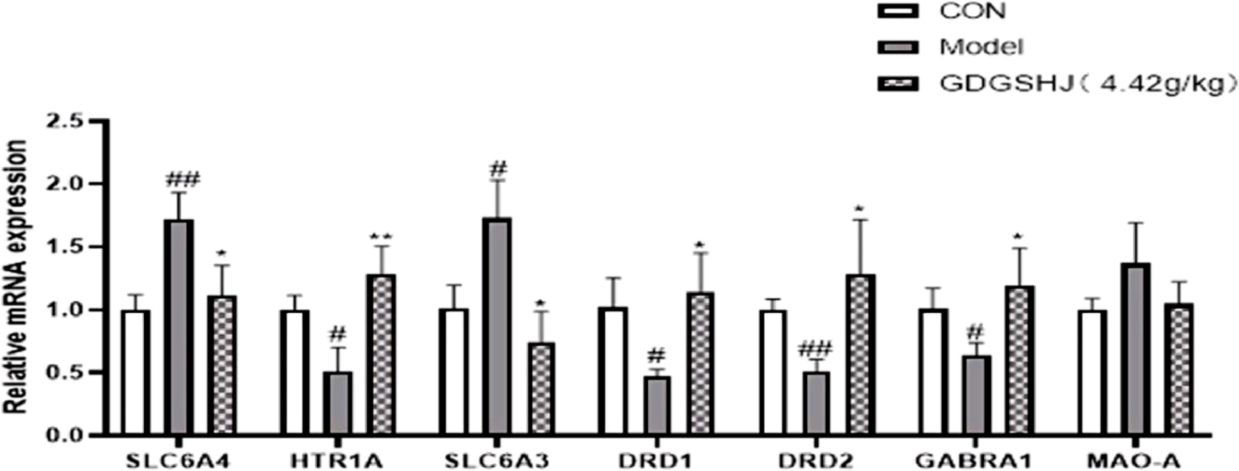 在CUMS刺激后,小鼠海马区SLC6A4和SLC6A3基因的mRNA表达明显上调。相反,HTR1A、DRD1、DRD2和GABRA1基因的mRNA表达则明显下调。相反,与模型组相比,给予中等剂量的GDGSHJ能显著逆转这些结果(图11)。