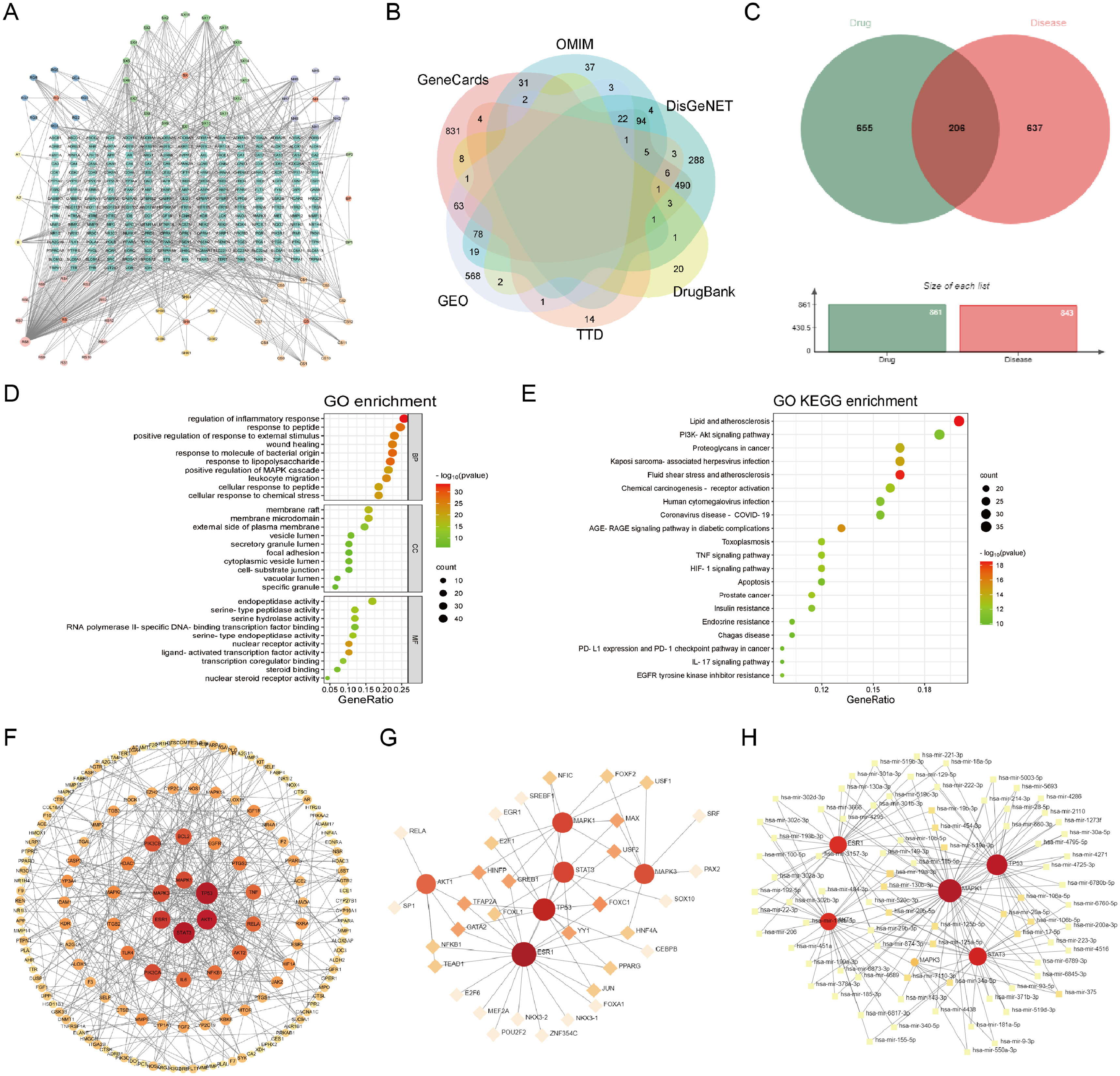 通过SwissADME和SwissTargetPrediction的筛选和预测,共发现了861个药物靶点,其中成分与靶点之间的对应关系如图1A所示。在至少两个数据库中筛选后,确定了843个动脉粥样硬化的疾病靶点(图1B)。药物与疾病靶点相互作用的维恩图见图1C。GO分析显示,CC项涉及膜筏和局灶粘附,MF项涉及核受体和内肽酶活性(图1D)。根据KEGG分析结果,脂质和动脉粥样硬化、细胞凋亡、PI3K-Akt和IL-17信号通路被强烈富集(图1E)。