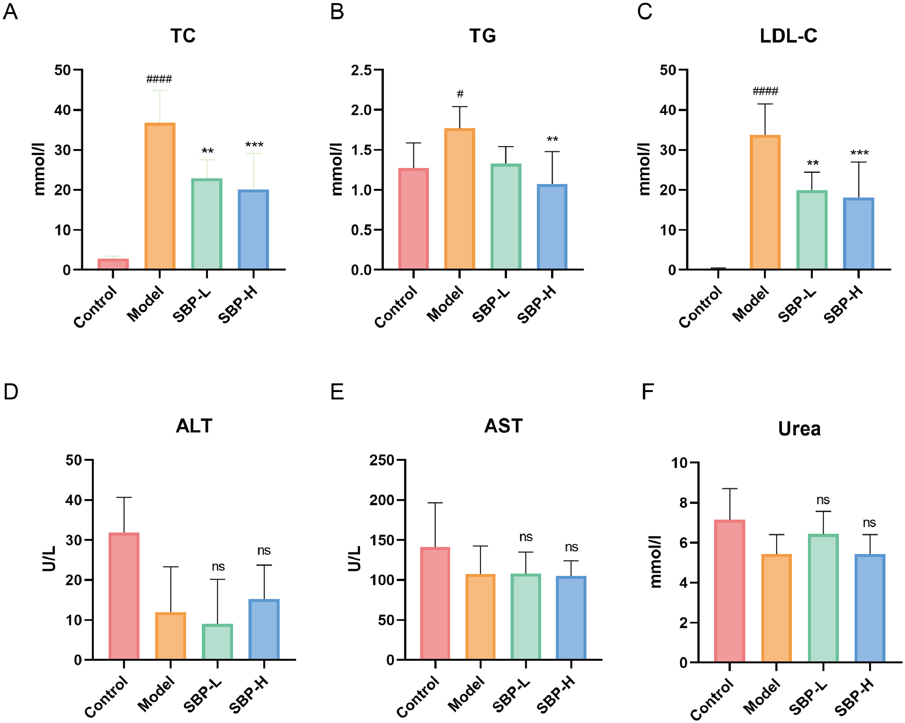在整个实验过程中,每三周记录一次体重。在每组之间观察到没有统计学上的显着差异,这表明SBP不会干扰小鼠的食欲或能量消耗。与模型组相比,治疗组在SBP灌饲12周后TC、TG和LDL-C水平显着降低(图2A-C)。此外,ALT、AST和Urea水平在组间无显著差异,表明SBP对小鼠的肝或肾功能没有影响(图2D-F)。