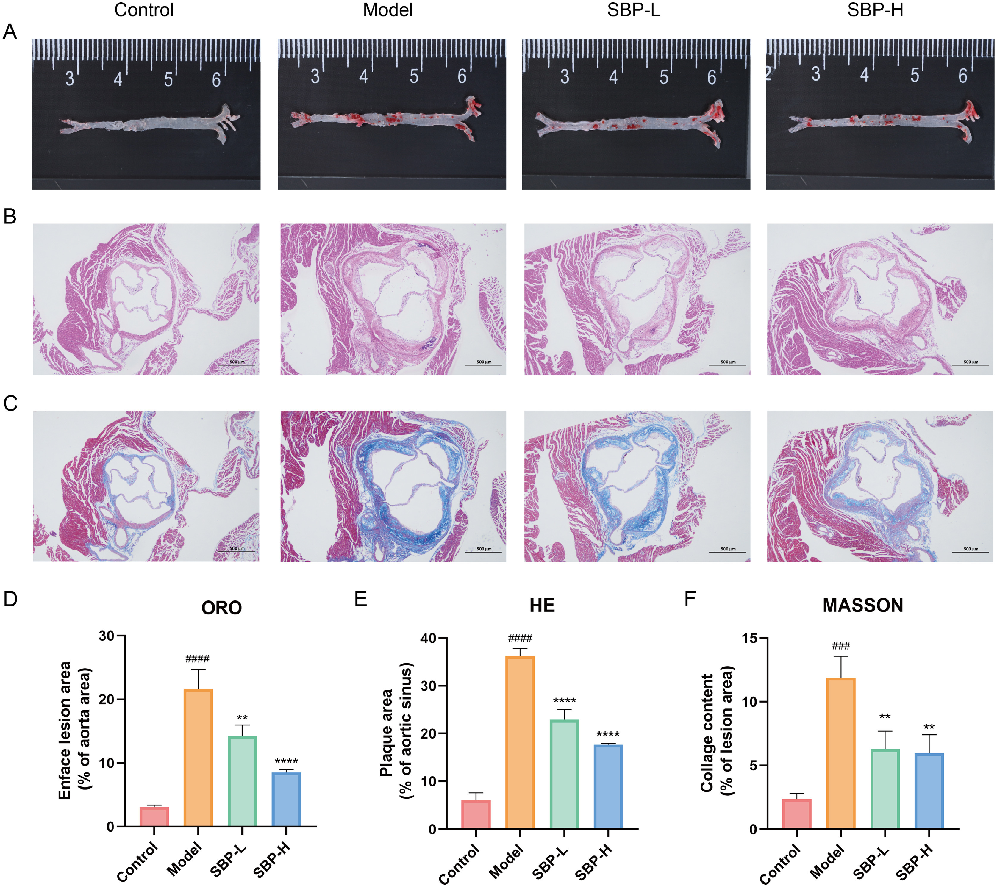 在组织病理学方面,最初通过量化主动脉斑块病变的尺寸来检查SBP对AS的影响。在模型组中,反映主动脉粥样硬化程度的油红O染色区域的百分比远高于对照组,而SBP抑制了这种变化(图3A)。此外,主动脉根部病变面积和胶原蛋白含量与H&E和Masson染色也是评估AS的关键指标,显示SBP表现出病变面积和胶原蛋白含量增加的显着逆转(图3B-C)。因此,这些结果表明SBP通过减少脂质积累和抑制主动脉斑块形成来改善AS。
