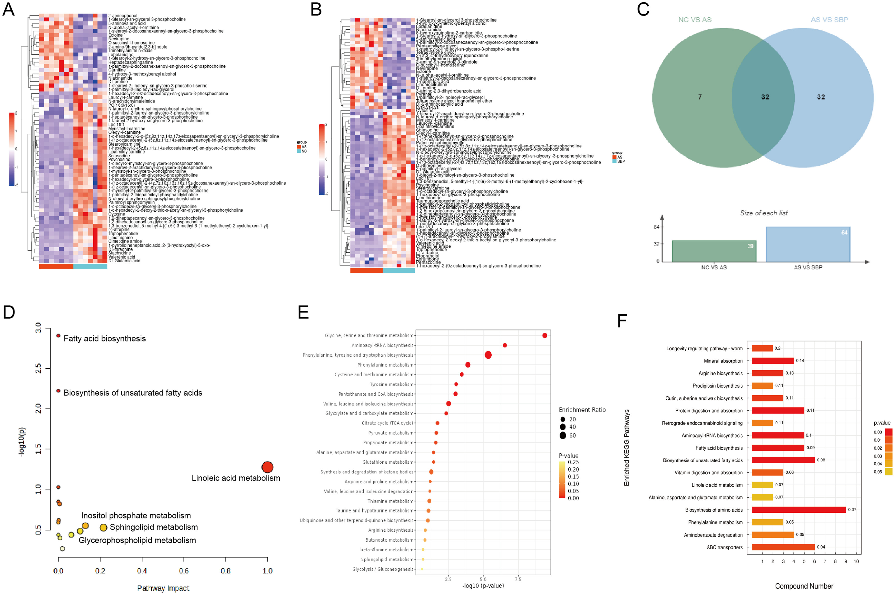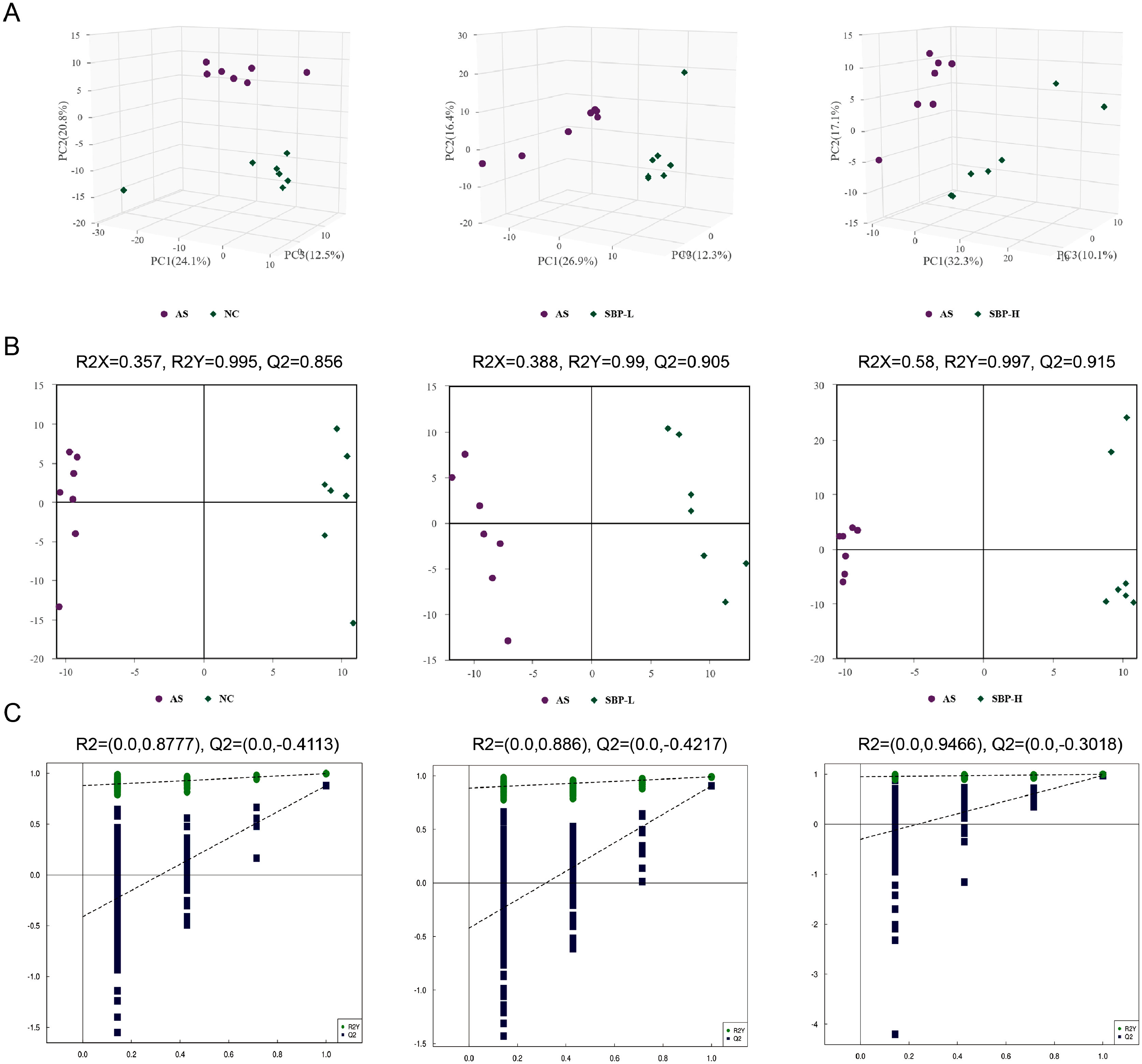为了研究SBP对动脉粥样硬化的代谢影响,对小鼠血清样本进行了代谢组学测定和分析。PCA是一种降尺度数据分析方法,它将最初鉴定出的代谢物进行线性重组,形成一个新的复合变量。在对照组、AS组和SBP组中,组间分离明显,组内聚集严重(图4A)。评价参数R2X、R2Y和Q2表明OPLS-DA具有良好的鲁棒性,不会出现过度拟合现象(图4B-C),因此适用于代谢物和通路分析。