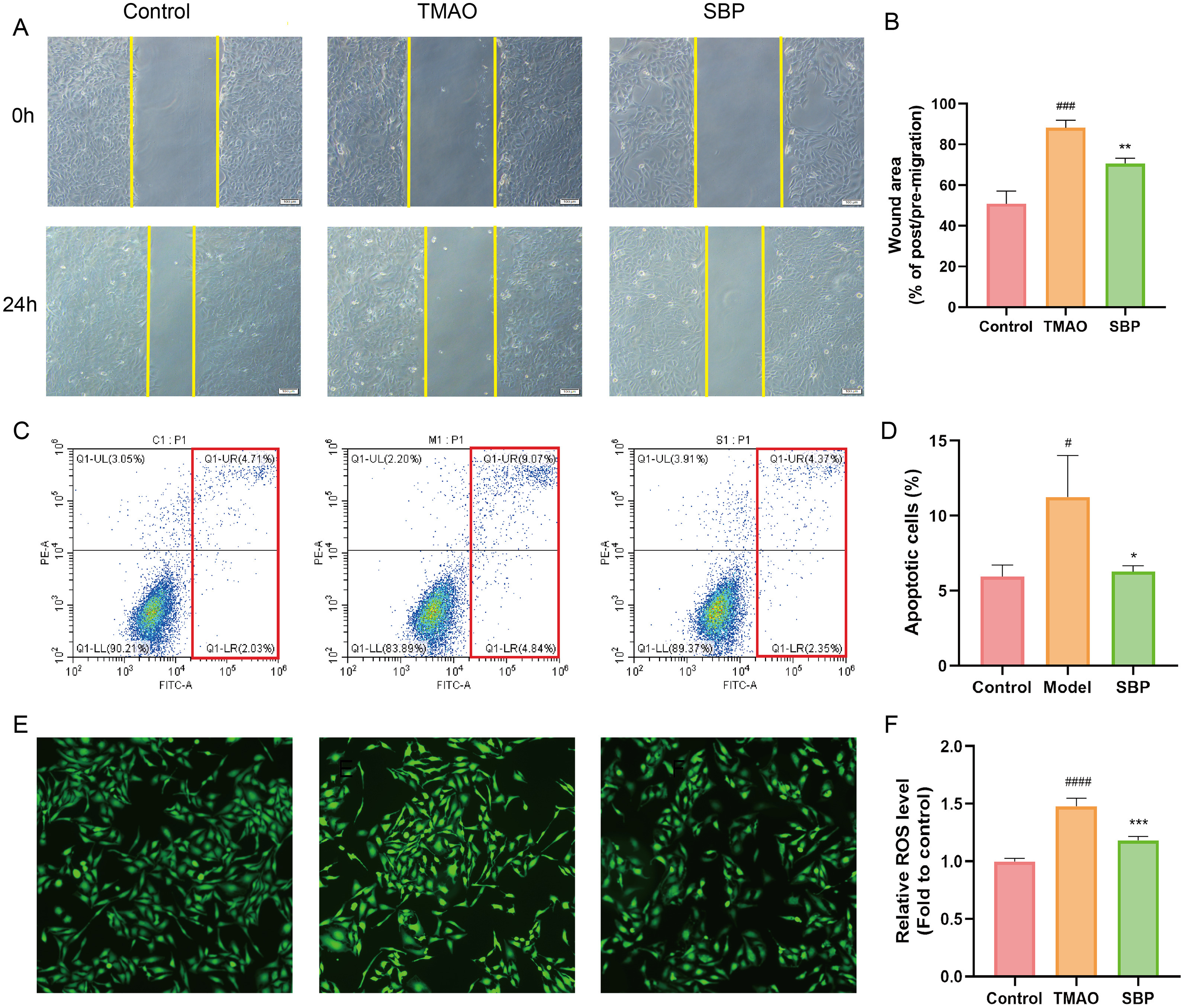 对初始组和划痕后24小时处理组的伤口面积进行了量化和比较,结果表明TMAO抑制了细胞迁移,而相反地在SBP组中观察到细胞迁移模式。这一发现表明,在刺激条件下,SBP与TMAO一样能抵消对细胞迁移的抑制(图6A-B)。研究表明,内皮细胞凋亡与ROS的产生密切相关。为了揭示TMAO和SBP对内皮细胞凋亡的影响,使用了流式细胞术。根据图5C中红色部分显示,TMAO增加了早期和晚期凋亡细胞的比例。服用SBP后,凋亡细胞的比例下降,表明SBP抑制了TMAO诱导的细胞凋亡(图6C-D)。此外,由于氧化应激是导致动脉粥样硬化恶化的重要因素,研究了SBP是否参与了细胞内ROS的清除。TMAO明显增加了HUVECs中的ROS水平,而SBP阻止了这些变化并降低了内皮氧化应激(图6E-F)。这些结果表明,SBP可抑制TMAO诱导的HUVEC细胞凋亡和氧化应激,并减轻TMAO对细胞迁移的抑制作用。