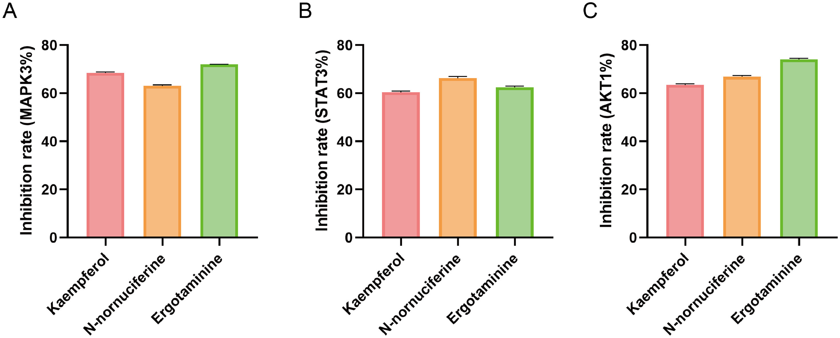 为了验证分子对接的准确性,通过酶抑制实验检测了山奈酚、N-核苷酸和麦角胺对MAPK3、STAT3和AKT1的抑制作用。山奈酚、N-核苷酸和麦角胺对MAPK1的抑制率分别为(68.52±±0.40)%、(63.07±±0.45)%和(72.04±±0.07)%、图10A);对STAT3的抑制率分别为(59.84±±0.51)%、(60.84±±0.70)%和(61.84±±0.59)%(图10B)。AKT1为(63.48±±0.45)%,(66.87±±0.47)%,(74.09±±0.45)%。0.49)%(图10C)。以上结果均大于50%,其中麦角胺对AKT1的抑制作用最强,这与分子对接结果一致。总之,酶抑制实验表明,这三种化合物对AKT1的抑制作用均在50%以上(图10C)。对这三种蛋白质的抑制作用,并在体外验证了分子对接的准确性。