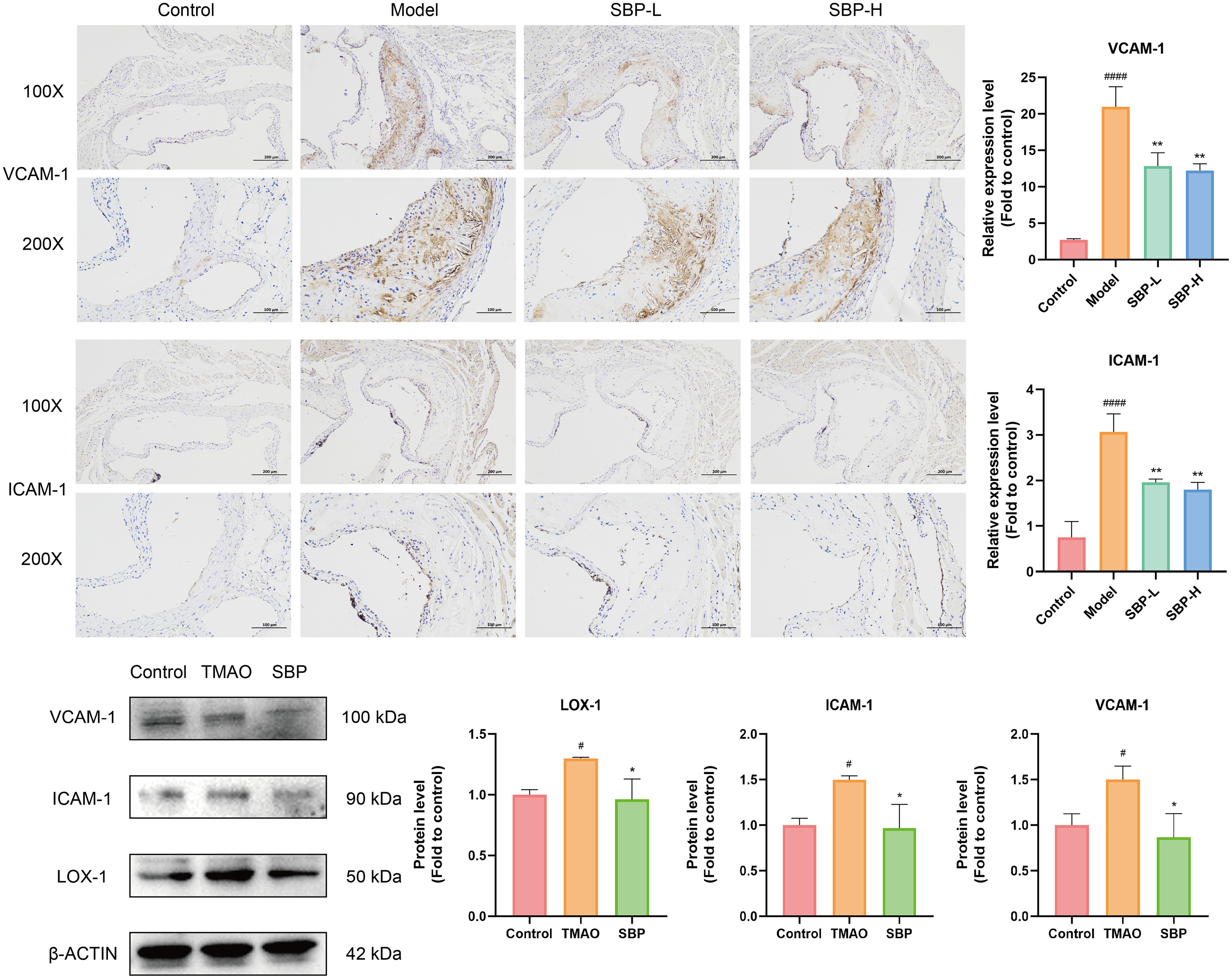 内皮功能障碍已被确定为诱发动脉粥样硬化的起始因素之一,而VCAM-1和ICAM-1的表达对于内皮功能障碍的调节至关重。研究SBP对内皮损伤调控的体内影响是通过免疫组化实验进行的。在模型中,VCAM-1和ICAM-1的水平显著升高。而SBP可抑制它们的表达(图7A-D)。在体外,发现TMAO增加了HUVEC中ICAM-1和VCAM-1的表达,相反,SBP组的ICAM-1和VCAM-1表达明显降低,这表明SBP在体外参与了对TMAO诱导的内皮损伤的保护。此外,LOX-1也是内皮功能障碍的指标之一,观察了它在TMAO和SBP作用下是否与ICMA-1有相同的趋势。TMAO可诱导HUVEC中LOX-1的表达上调,而SBP可抑制LOX-1的表达(图7E-H)。因此,研究结果表明,SBP可降低主动脉根部和HUVEC中LOX-1、ICAM-1和VCAM-1的表达,反映了SBP通过缓解内皮功能障碍对AS具有保护作用。