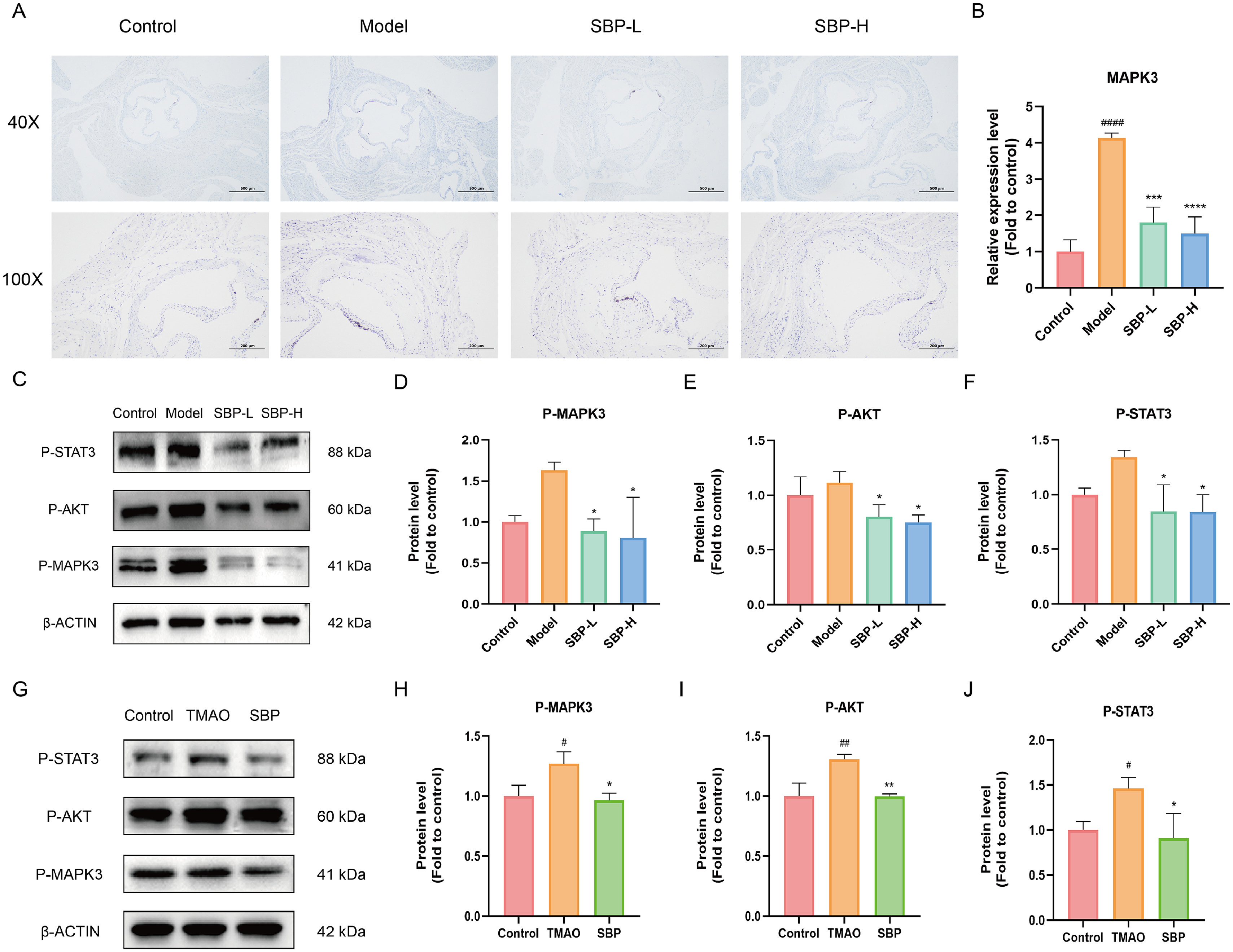 通过结合初步的网络药理学和代谢组学研究,作者预测MAPK3、AKT1和STAT3是SBP参与AS调控的关键靶标;接下来试图在体内和体外验证这些结果,对MAPK3的免疫组化分析表明,模型组中MAPK3表达上调,而SBP中表达下调(图8A-B)。对各组小鼠采集的主动脉组织进行的Western印迹分析表明,SBP逆转了磷酸化(P)-MAPK3、P-AKT1和P-STAT3表达增加的趋势(图8C-F)。此外,体外实验表明,TMAO上调了HUVEC中P-MAPK3、P-AKT1和P-STAT3的表达,而SBP则降低了这些基因的表达(图8G-J)。简而言之,这些结果提供了SBP通过调节MAPK3、AKT1和STAT3缓解动脉粥样硬化的证据。