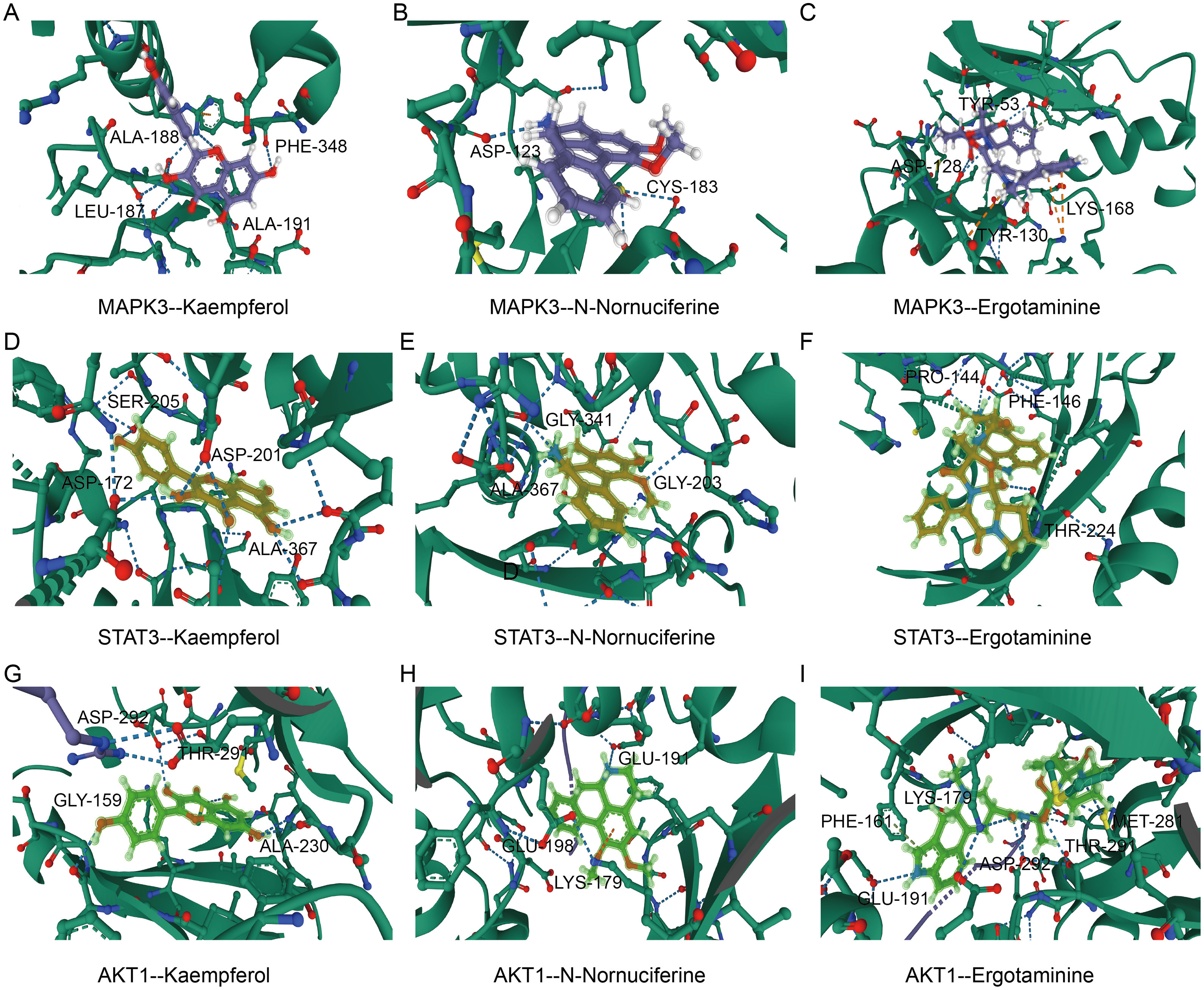 为了研究SBP有效成分与核心靶点之间的相互作用,进行了分子对接分析,选择了山奈酚、N-核苷酸和麦角胺作为配体,并根据配体与靶点网络的程度选择了山奈酚和麦角胺作为配体。选择MAPK3、STAT3和AKT1作为受体,它们的the best结合模式和亲和力如图9所示。根据分子对接的结果,本研究中评估的三种SBP成分能够与确定的三个靶点形成稳定的相互作用。