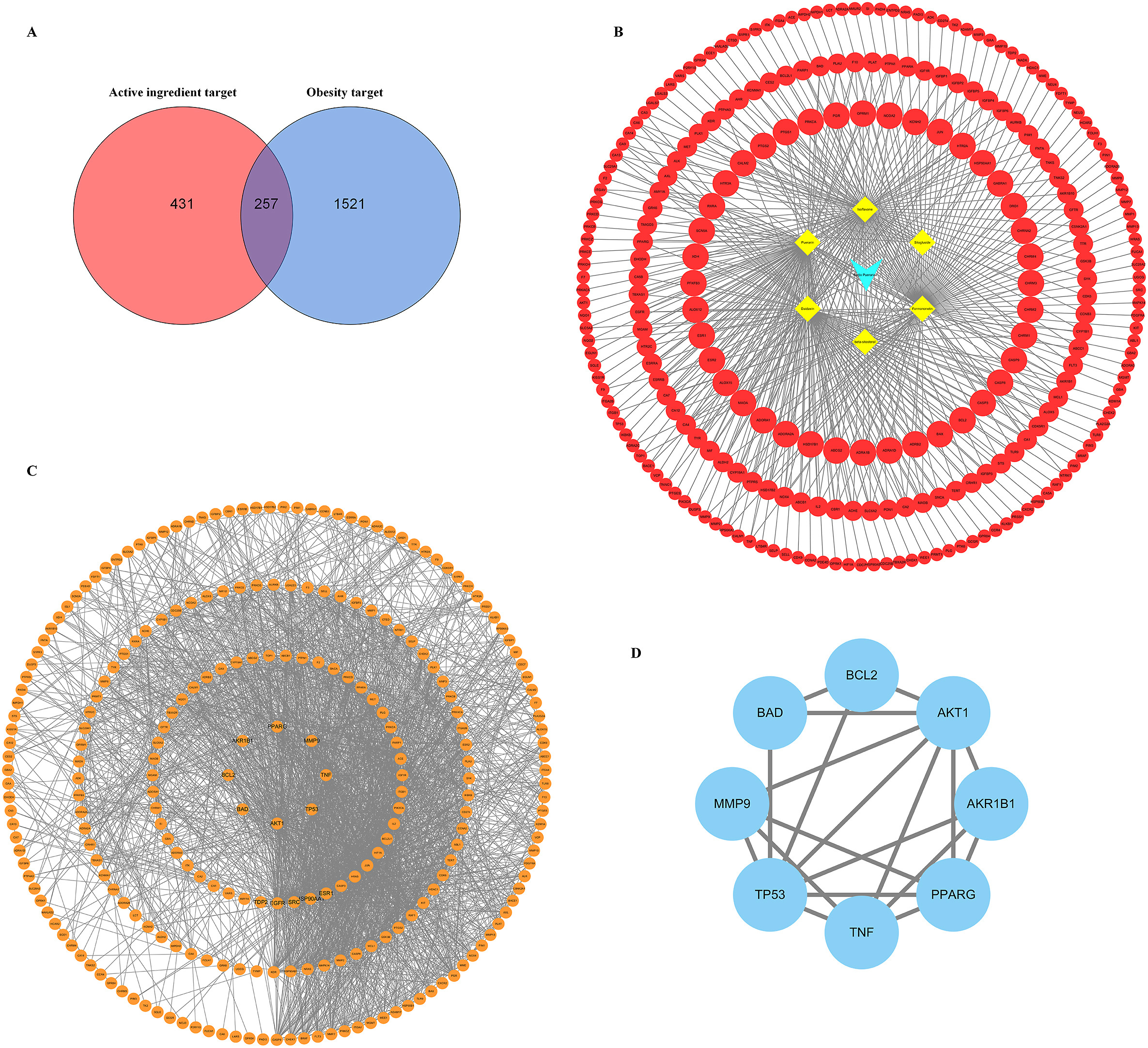 通过SwissTarget预测平台,得到了431个作用靶点。从GeneCards等数据库中共检索并整合了1521个肥胖症靶点。PR的活性成分和肥胖症共有靶点257个(图2A)。利用Cytoscape3.7.2软件进行可视化,然后得到PR、有效成分和目标的网络图(图2B)。