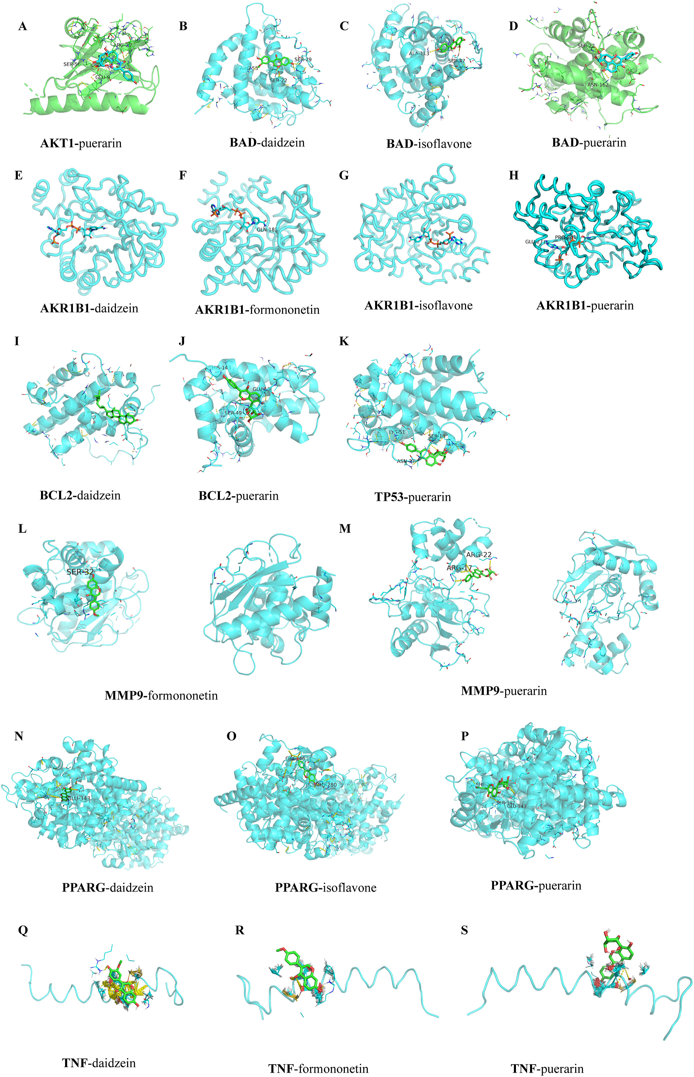 图4显示了6个化合物与肥胖症核心靶标的分子对接模式。对接结果显示,purerin 与 AKT1 蛋白的氨基酸残基 ARG-25 、 SER-56 和 GLU-9 形成氢键 (图4A);Daidzein与BAD蛋白的氨基酸残基ARG-55、SER-22和SER-29形成氢键(图4B);ALA-113和BAD蛋白的SER-47形成氢键(图4C);Purerin与BAD蛋白的氨基酸残基SER-22和ASN-162形成氢键(图4D);Daidzein与AItR1BI蛋白形成疏水作用(图4E);Formononetin与BAD蛋白的氨基酸残基GLN-183形成氢键(图4F)。7,8,4′-疏水性异黄酮与AKR1B1蛋白相互作用(图4G);Purerin与AKR1B1蛋白的氨基酸残基PRO-261和GLU-271形成氢键(图4H);黄豆苷元和BCL-2蛋白之间形成疏水相互作用(图4I);Purerin与BCL-2蛋白HIS-143、GLU-113和SER-49的氨基酸残基形成氢键(图4J);Purerin与TP53蛋白的氨基酸残基LYS-51、ASN-37和SER-18形成氢键(图4K);Formononetin与MMP-9蛋白的氨基酸残基SER-32形成氢键(图4L);葛根素与MMP-9蛋白的氨基酸残基ARG-17和ARG-22形成氢键(图4M);黄豆苷元与PPARG蛋白的氨基酸残基GLU-343形成氢键(图4N);7,8,4′-三羟基异黄酮与PPARG蛋白的GLY-346和ARG-280形成氢键(图4O);Purerin与PPARG蛋白的氨基酸残基SER-342、GLU-343和PHE-282形成氢键(图4P);黄豆苷元和TNF蛋白之间的疏水相互作用(图4Q);Formononetin与TNF蛋白形成疏水相互作用(图4R);葛根素和TNF蛋白形成疏水相互作用(图4S)。
