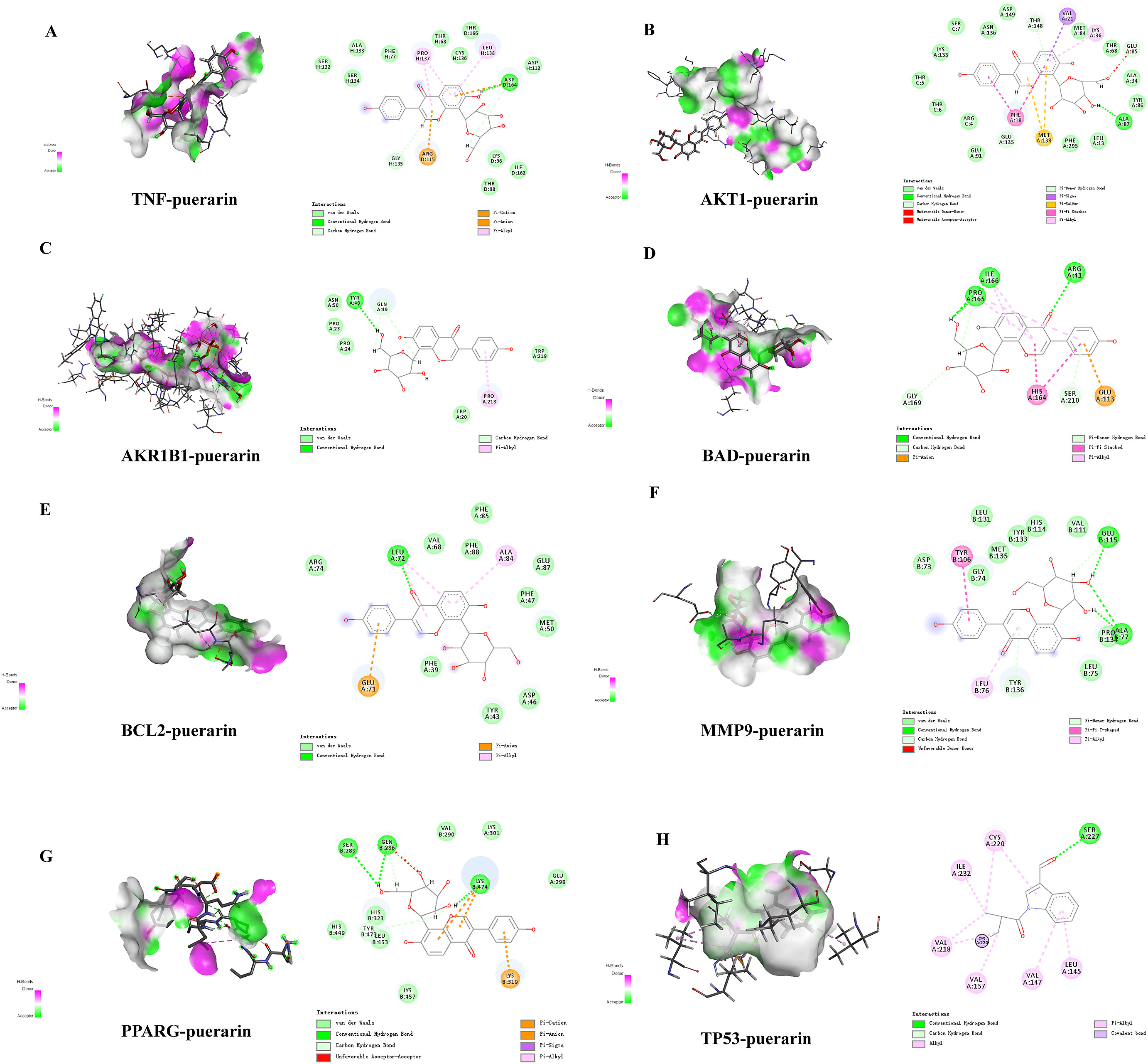 基于PPI网络,选择了度数前8名的核心靶基因与葛根素进行分子对接。TNF的LibDock评分为108.676(图5a),AKT1的LibDock评分为106.146(图5B),AKR1B1的评分为93.0223(图5C),BAD的评分为79.2118(图5D),BCL2的评分为78.982(图5E),MMP9的评分为105.4866(图5F),PPARG的评分为79.2118(图5 F)G)的对接评分为109.9212,与TP53结合的LibDock评分为106.189(图5H),葛根素与肥胖相关靶点的结合相对较好。