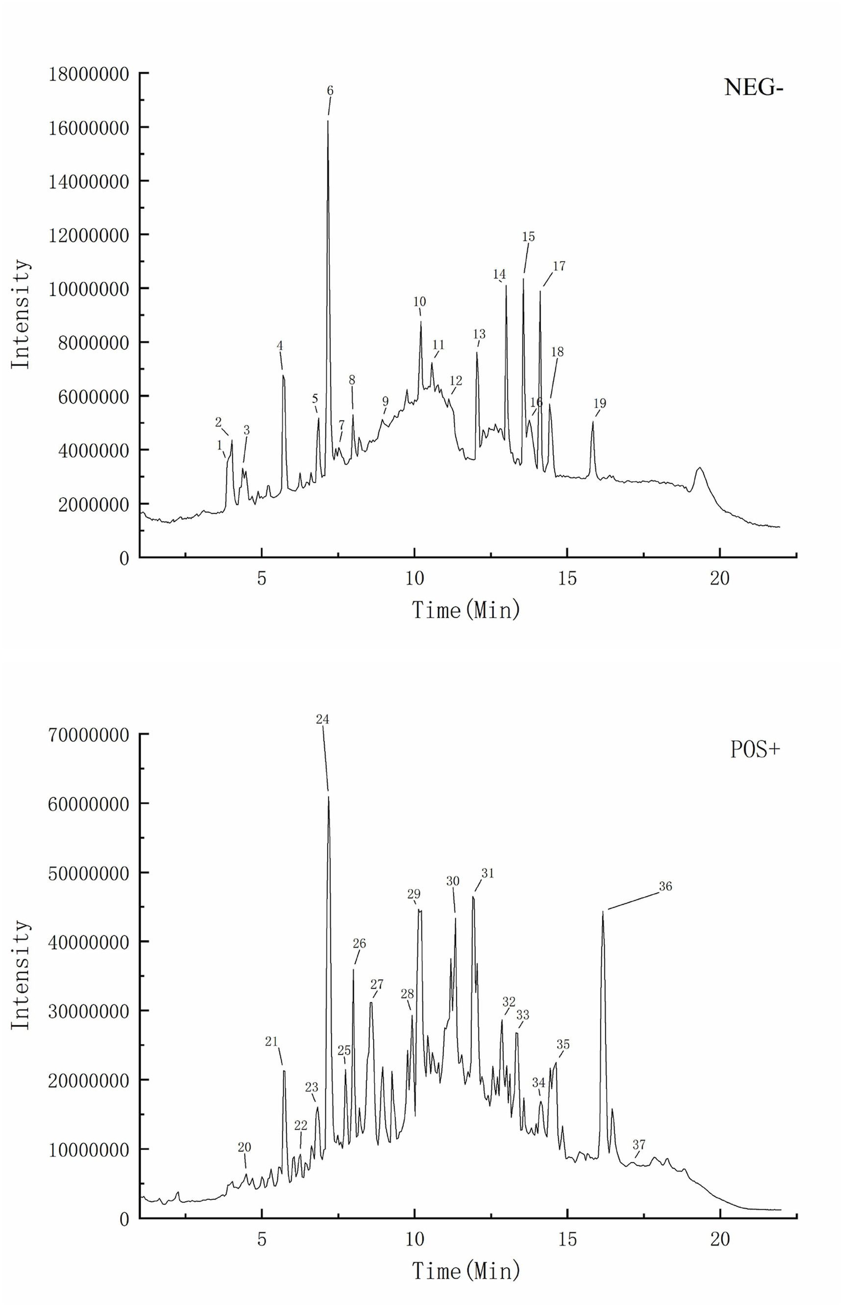 图中显示了正离子模式(图6A)和负离子模式(图6B)下 PR 样品的典型总离子色谱图。共有37种化合物。通过分析UPLC-MS和GC-MS数据,确定了上述源自 PR 的6个成分。