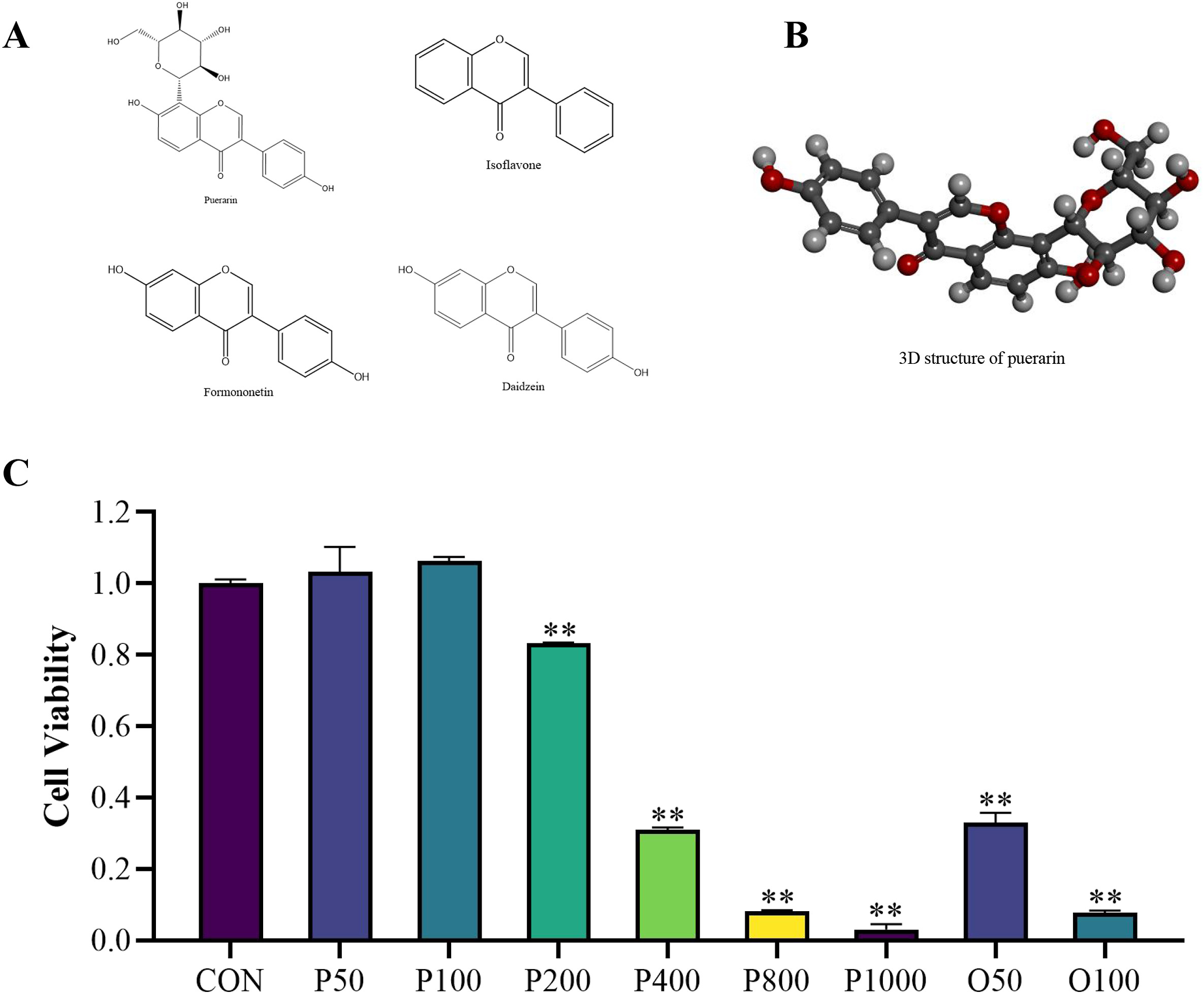 图7A显示了4种活性PR化合物的二维结构图。图7B为PP中LibDock得分highest的化合物(葛根素)的三维结构图。为了研究葛根素对3T3-LI细胞活性的影响,本研究比较了加入或不加入不同浓度的葛根素(50、100、200、400、800和1000mg/L)和不同浓度的奥利司他阳性药物(50和100mg/L)后的对照组。发现葛根素以剂量依赖的方式降低了3T3-LI前脂肪细胞的活性,这与阳性药物的趋势一致(图7C)。