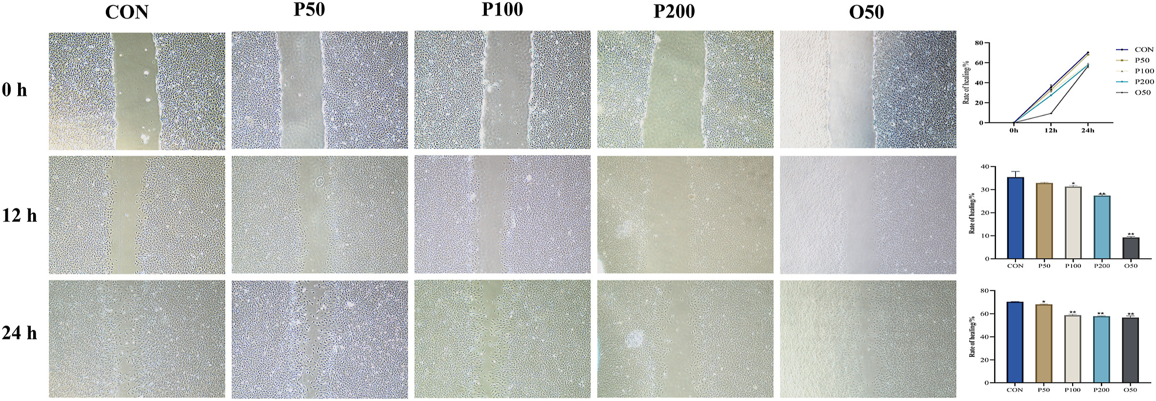 为探讨葛根素对3T3-LI细胞迁移率的影响,通过细胞划痕水平验证葛根素对细胞划痕愈合程度的影响,并对干预后12、24h分别添加或不添加不同浓度葛根素(50、100、200mgJL)和50mg/L奥利司他阳性药物的划痕伤口愈合程度进行统计(图8)。药物治疗12h后,葛根素50、100和200mgJL治疗组的划痕愈合率分别为34.82%、33.88%和26.93%,阳性药物组的划痕愈合率为24.47%。24小时后,50、100和200mgJL治疗组葛根素的划痕愈合率分别为66.23%、58.74%和51.63%,阳性药物组的划痕愈合率为56.31%。结果表明,葛根素对细胞迁移有一定的抑制作用,其剂量依赖性与阳性药物组相同。