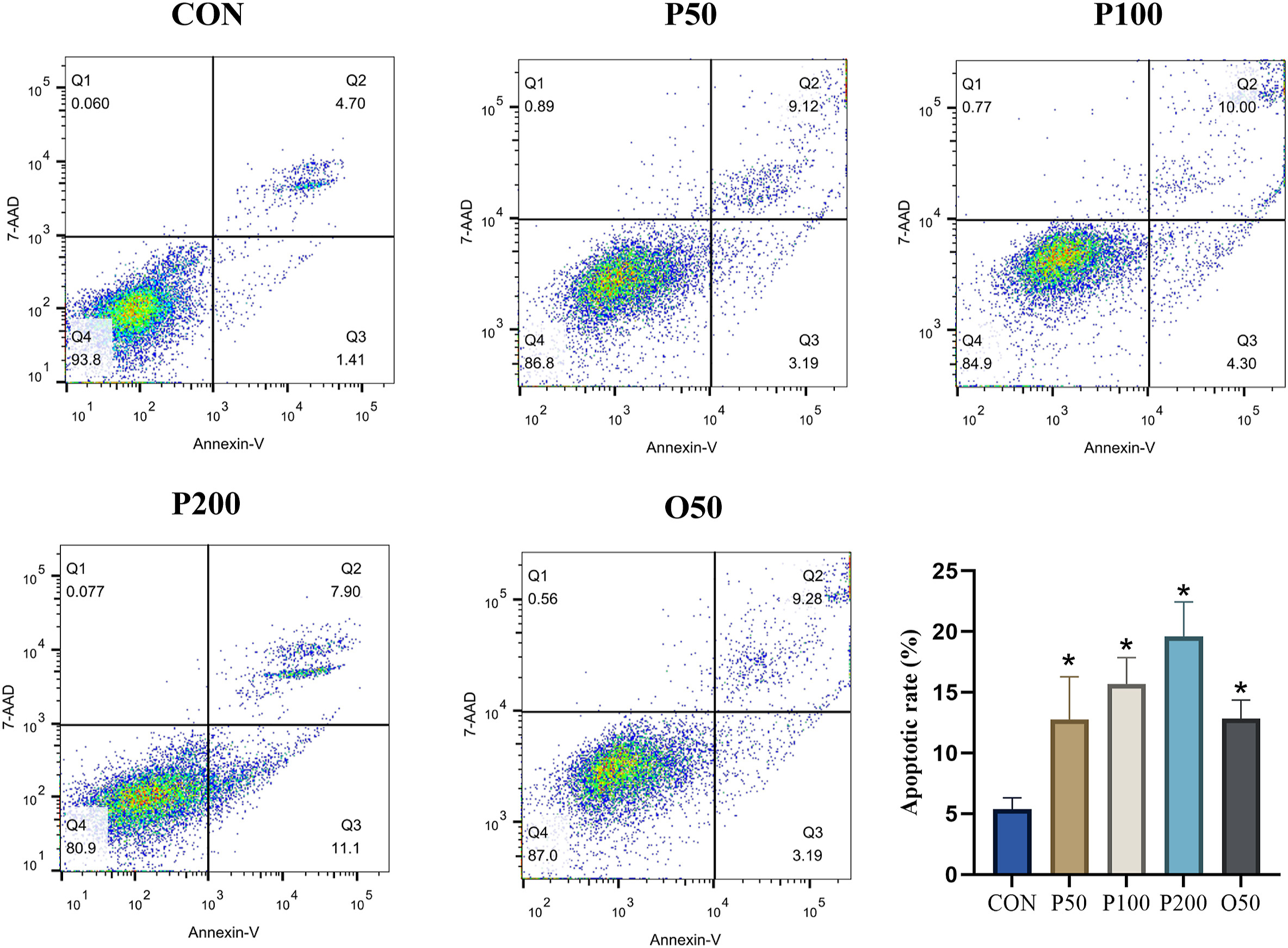 通过检测葛根素对细胞凋亡的影响,验证了葛根素对3T3-LI细胞活力的影响(图9)。与对照组相比,不同浓度(50、100和200mg/L)的葛根素和50mg/L奥利司他阳性药物的细胞凋亡率分别为12.31%、14.30%和19.00%。随着剂量的增加,葛根素对细胞凋亡的促进作用相同,且促进细胞凋亡的趋势呈上升趋势,说明葛根素能促进细胞凋亡。