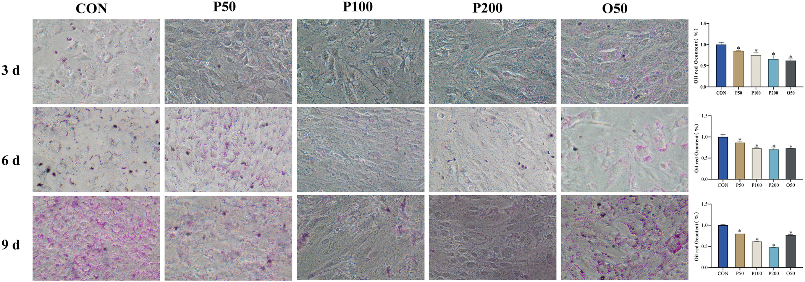 为了确定葛根素是否具有抑制成脂分化的作用,本研究对添加或不添加不同浓度(50、100、200mgJL)葛根素的细胞进行了油红O染色,并设立了药物干预阳性组。与完全分化的脂肪细胞相比,葛根素剂量依赖性地抑制了3T3-LI细胞在第3、6和9天的脂滴生成(图10)。第9天的抑制效果更明显,且抑制效果优于阳性药物。因此,葛根素可减少3T3-LI细胞脂肪分化过程中的脂质积累。