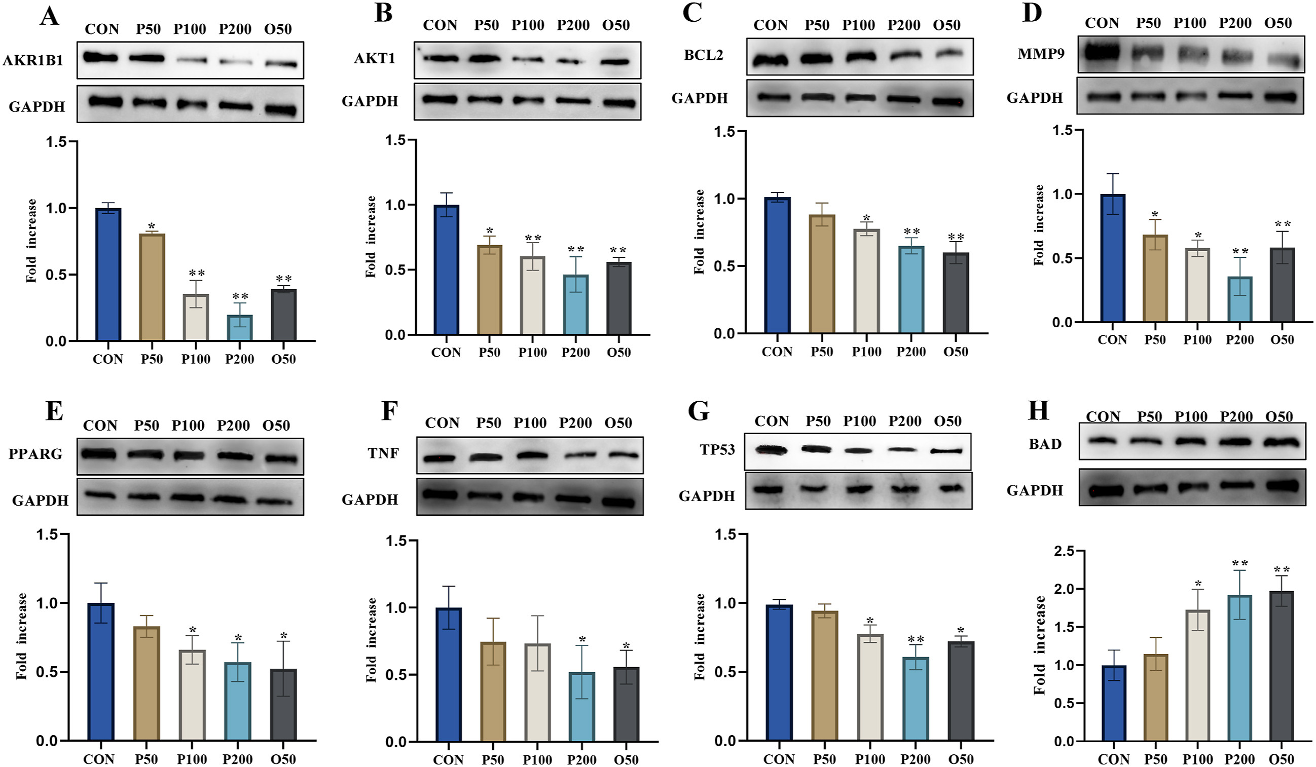与对照组相比,模型组AKR1B1(图11A)、AKT1(图11B)、BCL2(图11C)、MMP9(图11D)、PPARG(图11E)、TNF(图11F)和TP53(图11G)蛋白的表达水平显著升高(P<0.05),而BAD的表达水平(图11H)蛋白显著降低(P <0.05)。与模型组相比,给药组AKT1、AKR1B1、PPARG、MMP9、TNF、TP53和BCL2蛋白表达水平显著降低(P <0.05),而BAD蛋白表达水平显著升高(P <0.05)。