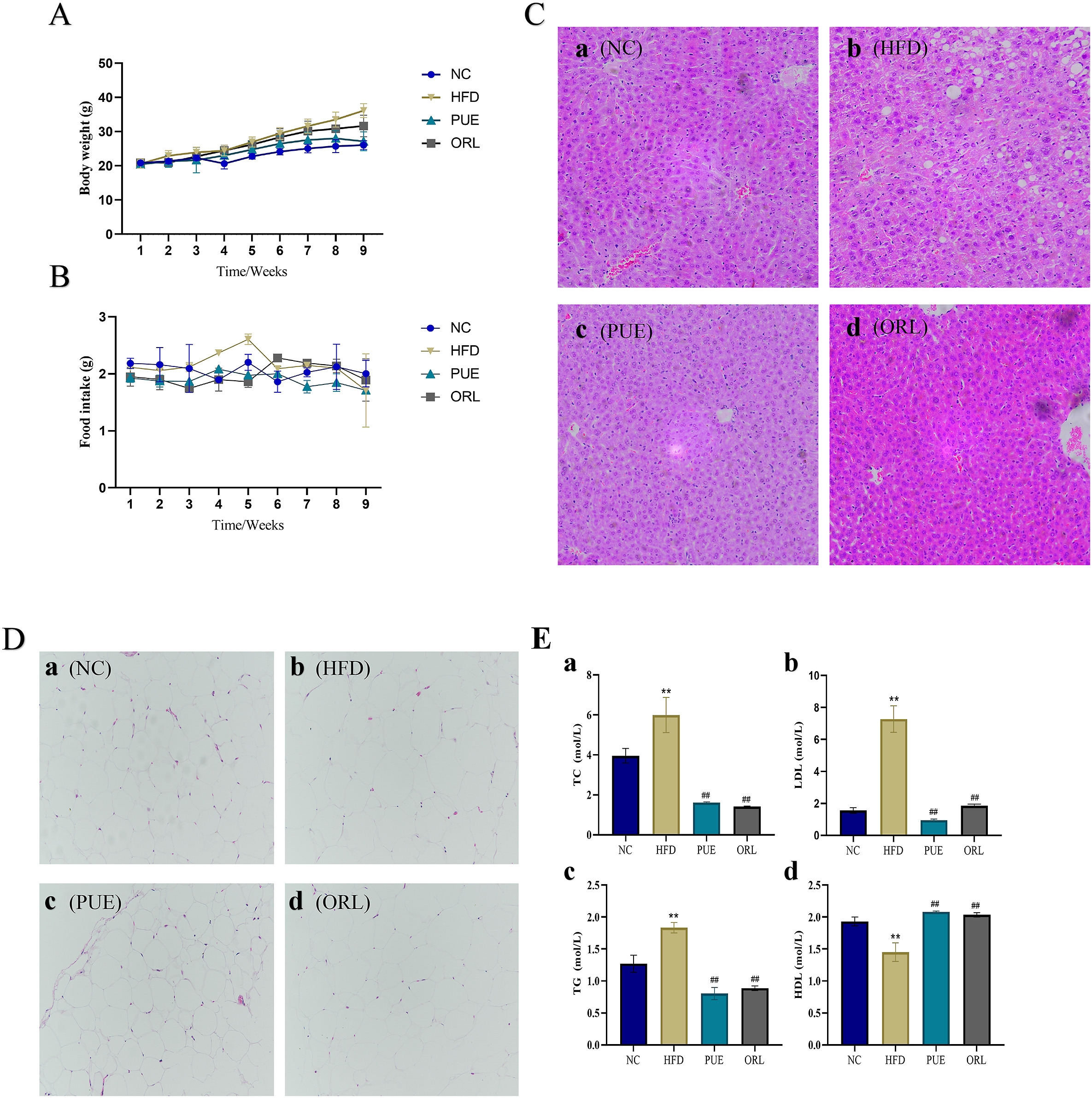 在研究结束时(第9周),与其他组相比,实验组之间的食物摄入量有所减少,如图 12B.NC:第1周20.849,第9周26.065,增加25.02%HFD:第1周20.609,第9周36.134,增加75.33%PUE:第1周20.456,第9周27.166,增加32.80%ORL:第1周20.905,第9周31.647,增加51.38%。所有小鼠的体重变化如图 12A所示。NC组小鼠体重增加了25.02%,而高脂饮食喂养的动物体重增加了75.33%,显著高于NC组。然而,PUE组小鼠的体重仅比初始体重增加了32.80%,显著低于HFD组。这表明PUE干预可以降低体重增加的速度。
