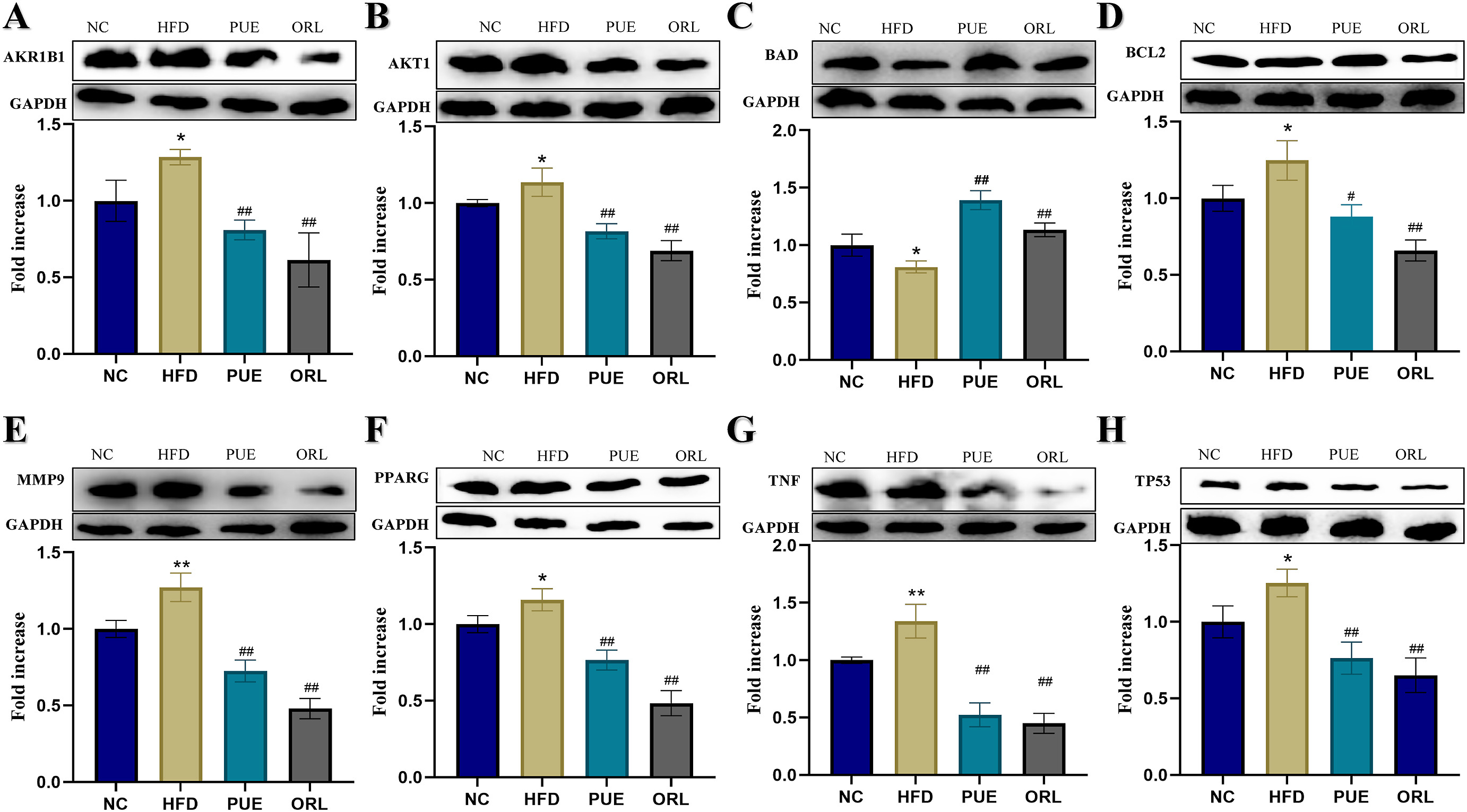 Westernblot结果显示,如图13 所示,与NC组相比,HFD显著上调PPARG、BCL2、TNF、AKT、TP53、MMP9、AKR1B1,显著下调BAD。与HFD组相比,PUE组显著改善PPARG、BCL2、TNF、AKT、TP53、MMP9、AKR1B1的上调和BAD的下调。