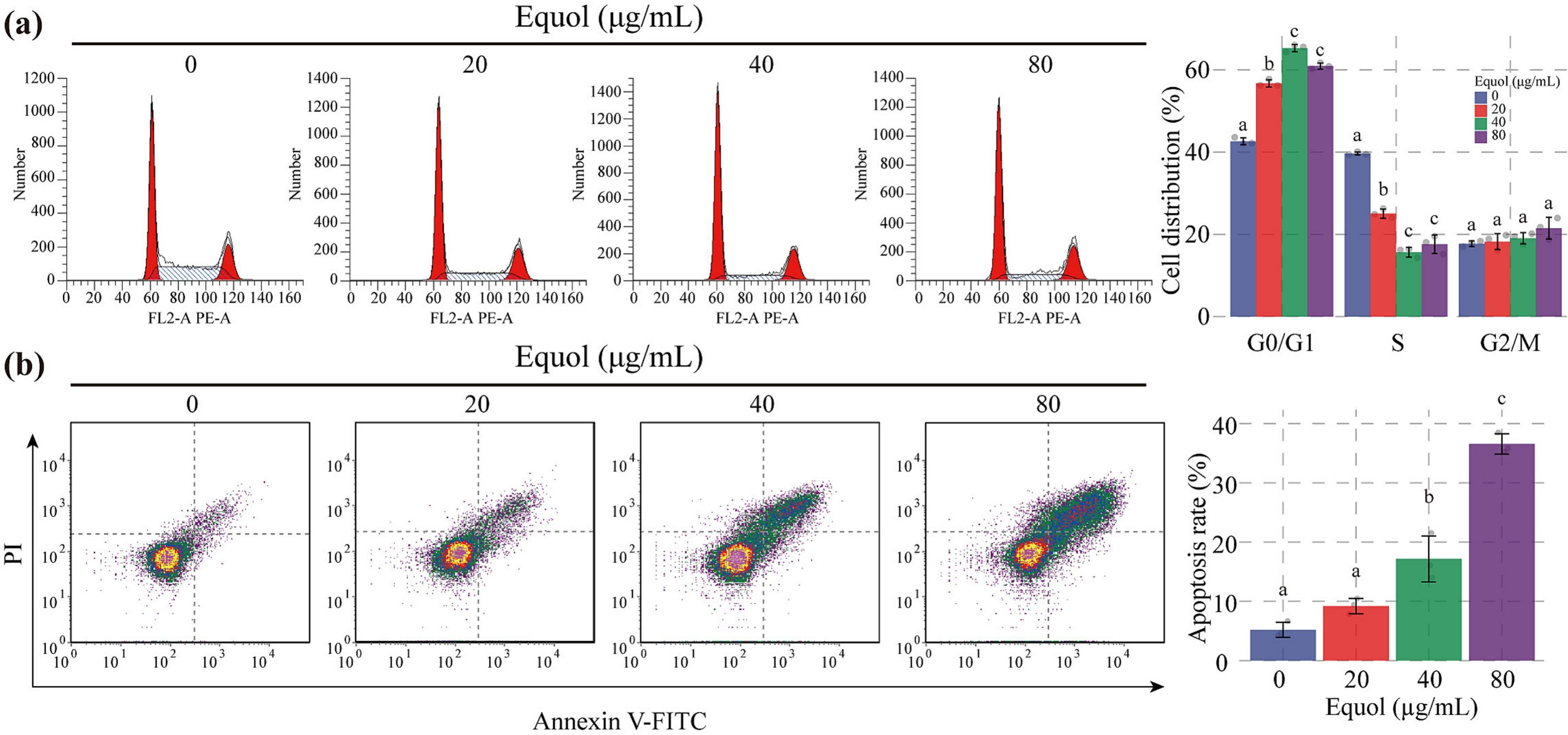 流式细胞术用于评估雌马酚是否能诱导细胞周期停滞和细胞凋亡。图2a显示了HCT116细胞群的不同阶段。此外,雌马酚干预后G2/M期细胞的比例增加,但未显著增加。细胞凋亡的流式细胞术结果如图 2b所示,细胞凋亡率与雌马酚剂量呈正相关。这些结果表明,雌马酚可以诱导细胞周期停滞并以剂量依赖性方式促进细胞凋亡。
