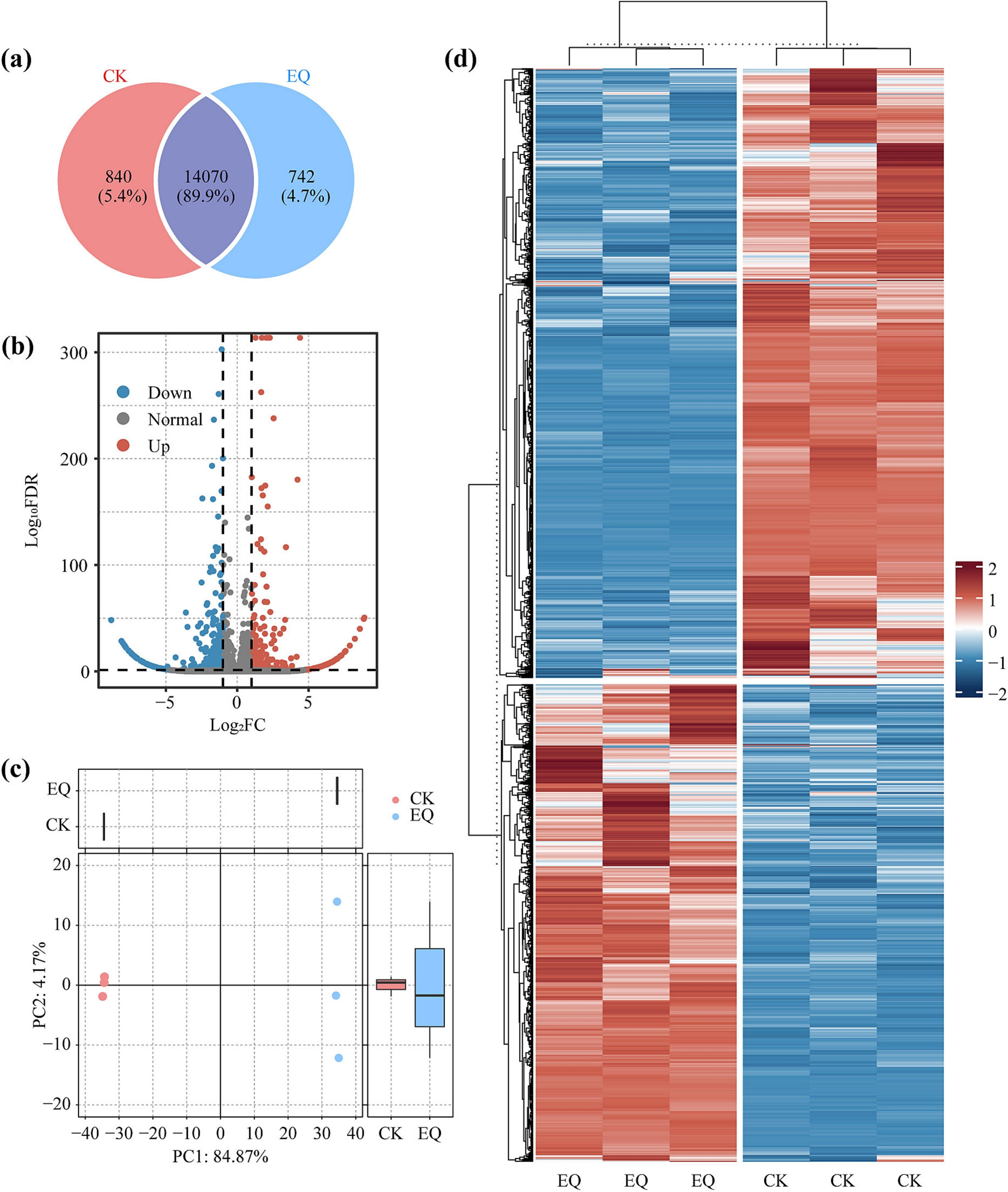 对照组(CK)和马肝酚处理组(EQ)的基因如维恩图所示(图3a),在CK和EQ组中分别检测到14,910和14,812个基因,在EQ和CK组之间鉴定了1685个DEGs(图3b)。根据PCA分数图(图3c),样本沿第一主成分(PC1)明确分为两组,占方差的84.87%。因此,很明显雌马酚处理的癌细胞(HCT116细胞)改变了基因表达。差异表达基因的分层聚类和热图分析如图 3d所示。热图中可见的不同模式表明,雌马酚处理会诱导HCT116细胞转录组学的显着变化。这一观察结果有力地支持了我们的假设,即雌马酚对结直肠癌细胞的基因表达模式有重大影响。