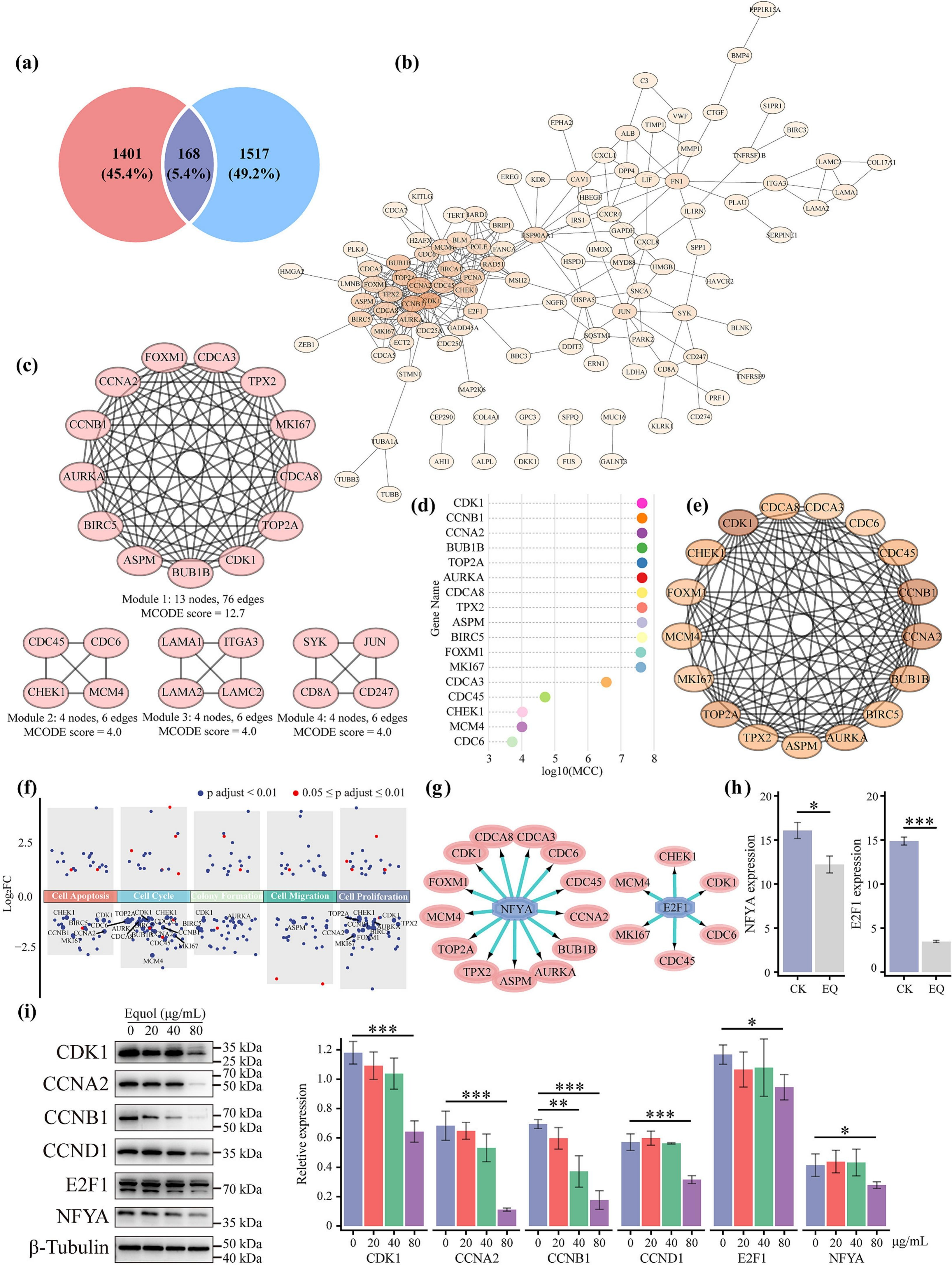 从GeneCards数据库和转录组学分析,获得了168个目标基因(图4a)。PPI分析了来自168个候选基因的112个基因,其中包括112个节点和310个边缘(图4b)。Cytoscape分析如图 4c所示。共有17个具有maximum团中心性(MCC)的基因被选为候选基因(图 4d)。17个枢纽基因之间的相互作用如图4e所示。TF基因靶标调控网络如图 4g所示,2个TFs在对癌细胞进行雌马酚处理后下调(图 4h)。Western blot实验表明,癌细胞接受80μg/mL的马其酚后,CDK1、CCNA2、CCND1、E2F1和NFYA的表达降低,而CCNB1的表达在接受40μg/mL的雌马酚后表达降低(图 4i)。