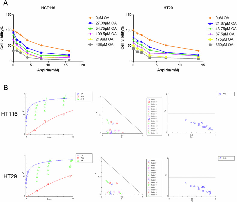 OA和阿司匹林联合使用对HCT-116和HT-29细胞的增殖抑制作用显著增强。通过CompuSyn软件分析联合指数(CI)及相关指标,发现所有OA/阿司匹林剂量组合的CI值均小于0.7,表明两者在检测浓度范围内具有协同作用(图3A-B)。